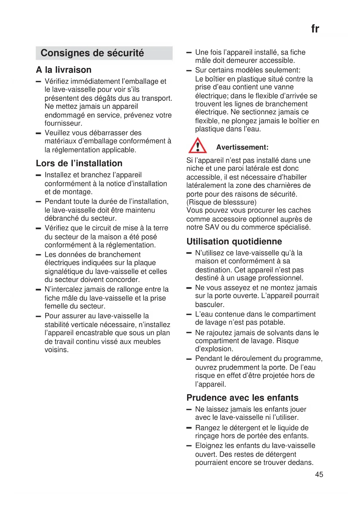 Si l’appareil n’est pas installé dans une niche et une paroi latérale est donc accessible, il est nécessaire d’habiller latéralement la zone des charnières de porte pour des raisons de sécurité. (Risque de blesssure) Vous pouvez vous procurer les caches comme accessoire optionnel auprès de notre SAV ou du commerce spécialisé. Utilisation quotidienne N’utilisez ce lave-vaisselle qu’à la maison et conformément à sa destination. Cet appareil n’est pas destiné à un usage professionnel. Ne vous asseyez et ne montez jamais sur la porte ouverte. L’appareil pourrait basculer. L’eau contenue dans le compartiment de lavage n’est pas potable. Ne rajoutez jamais de solvants dans le compartiment de lavage. Risque d’explosion. Pendant le déroulement du programme, ouvrez prudemment la porte. De l’eau risque en effet d’être projetée hors de l’appareil. Prudence avec les enfants Ne laissez jamais les enfants jouer avec le lave-vaisselle ni l’utiliser. Rangez le détergent et le liquide de rinçage hors de portée des enfants. Eloignez les enfants du lave-vaisselle ouvert. Des restes de détergent pourraient encore se trouver dedans.fr