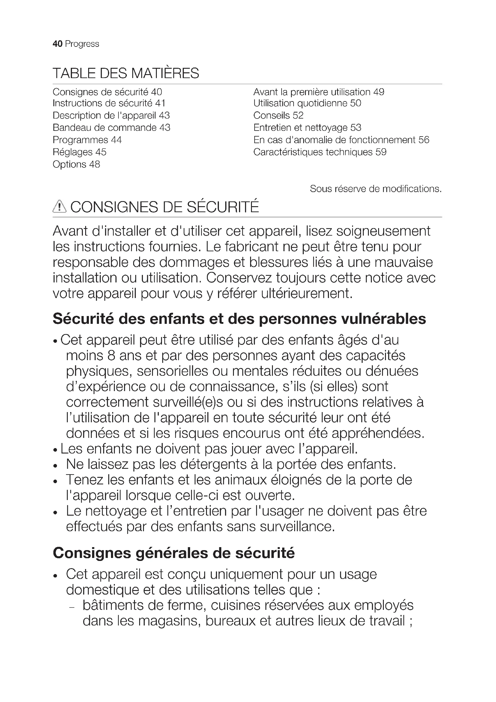 - Retirez le dispositif de verrouillage de la porte pour empêcher les enfants et les animaux de s'enfermer dans l'appareil. 42 ProgressDESCRIPTION DE L'APPAREIL