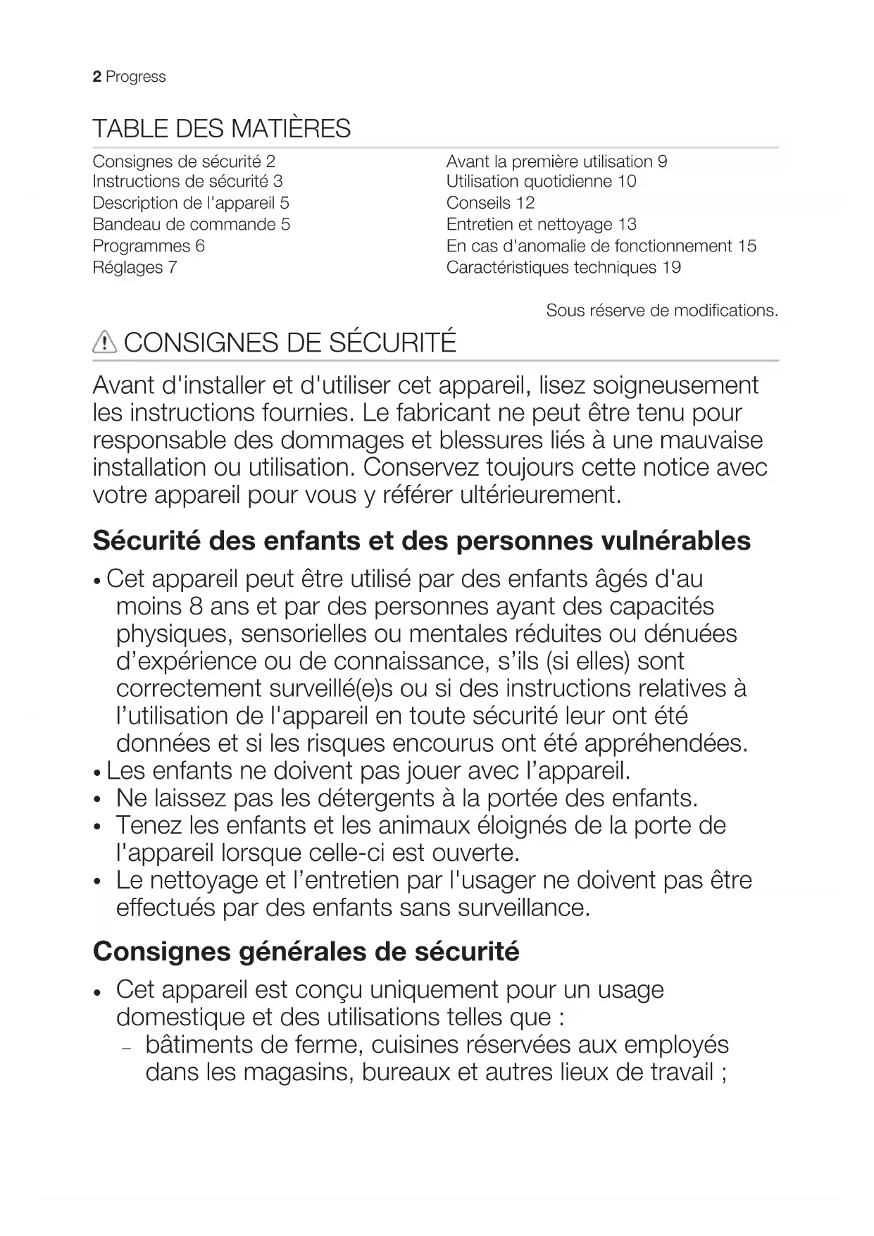 - Placez les objets délicats dans le panier supérieur. Reportez-vous aux chapitres « Avant la première utilisation », « Utilisation quotidienne » ou « Conseils » pour connaître les autres causes probables. 18 ProgressCARACTÉRISTIQUES TECHNIQUES Dimensions Largeur / hauteur / profon- deur (mm) 596 / 818-898 / 555 Branchement électrique