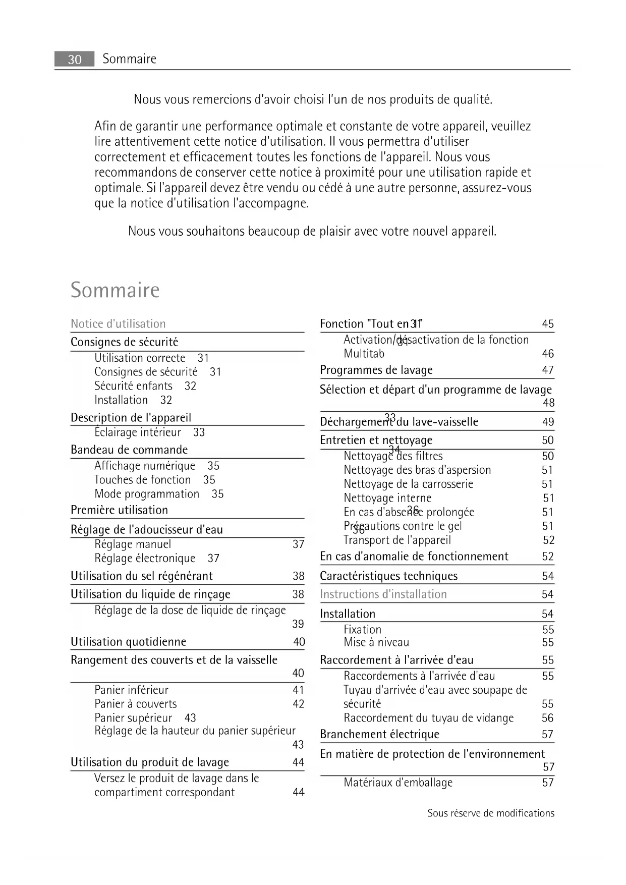 - Verwijder het slot van de deur. Zo voorkomt u dat kinderen zichzelf insluiten en hun leven in gevaar brengen. Aansluiting aan het elektriciteitsnet 29Nous vous remercions d’avoir choisi l’un de nos produits de qualité. Afin de garantir une performance optimale et constante de votre appareil, veuillez lire attentivement cette notice d'utilisation. Il vous permettra d’utiliser correctement et efficacement toutes les fonctions de l’appareil. Nous vous recommandons de conserver cette notice à proximité pour une utilisation rapide et optimale. Si l'appareil devez être vendu ou cédé à une autre personne, assurez-vous que la notice d'utilisation l'accompagne. Nous vous souhaitons beaucoup de plaisir avec votre nouvel appareil. Sommaire Notice d'utilisation 31 Consignes de sécurité 31 Utilisation correcte 31 Consignes de sécurité 31 Sécurité enfants 32 Installation 32 Description de l'appareil 33 Éclairage intérieur 33 Bandeau de commande 34 Affichage numérique 35 Touches de fonction 35 Mode programmation 35 Première utilisation 36 Réglage de l'adoucisseur d'eau 36 Réglage manuel 37 Réglage électronique 37 Utilisation du sel régénérant 38 Utilisation du liquide de rinçage 38 Réglage de la dose de liquide de rinçage