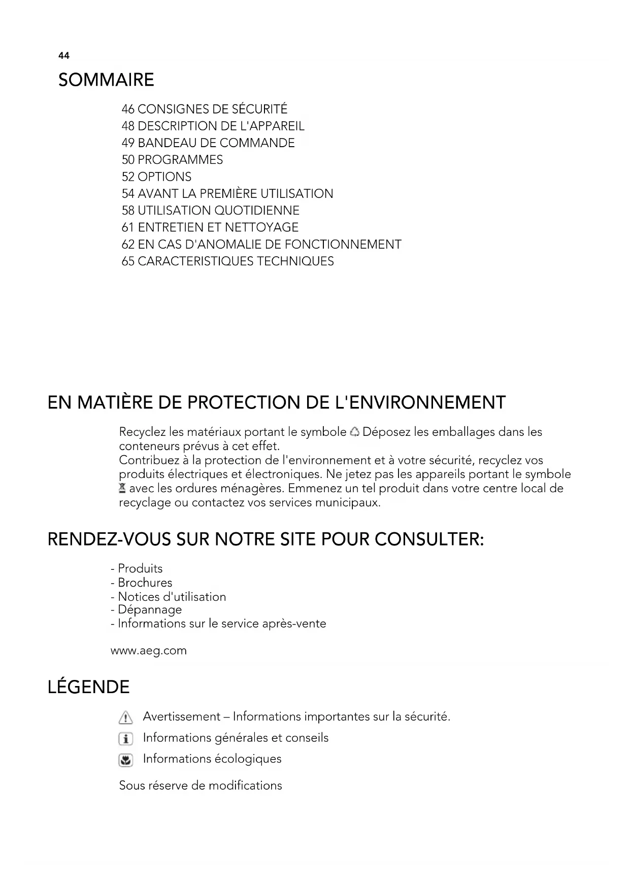 65 CARACTERISTIQUES TECHNIQUES EN MATIÈRE DE PROTECTION DE L'ENVIRONNEMENT Recyclez les matériaux portant le symbole . Déposez les emballages dans les conteneurs prévus à cet effet. Contribuez à la protection de l'environnement et à votre sécurité, recyclez vos produits électriques et électroniques. Ne jetez pas les appareils portant le symbole avec les ordures ménagères. Emmenez un tel produit dans votre centre local de recyclage ou contactez vos services municipaux. RENDEZ-VOUS SUR NOTRE SITE POUR CONSULTER: - Produits - Brochures - Notices d'utilisation - Dépannage - Informations sur le service après-vente www.aeg.com LÉGENDE Avertissement – Informations importantes sur la sécurité. Informations générales et conseils Informations écologiques Sous réserve de modifications