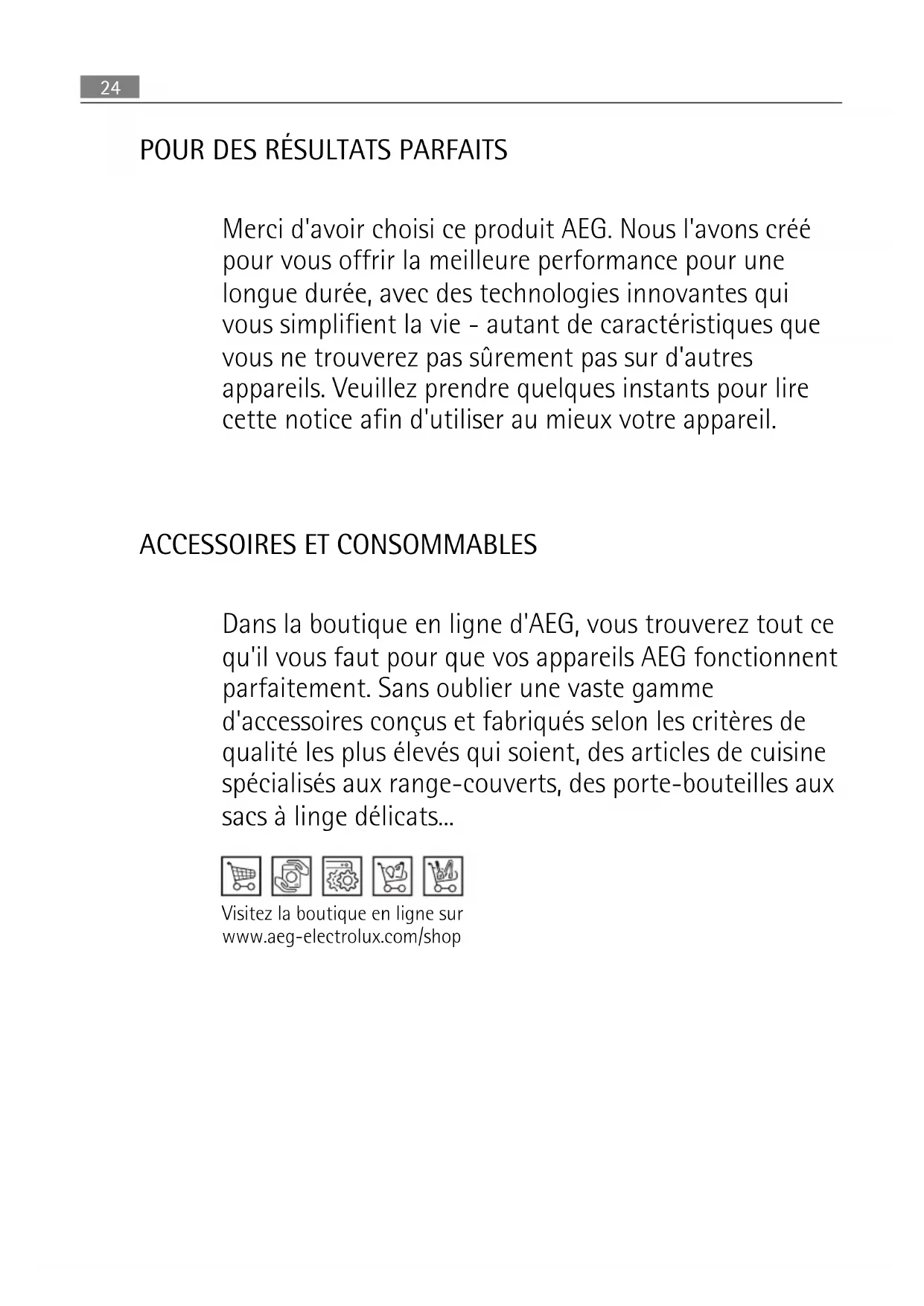 Dans la boutique en ligne d'AEG, vous trouverez tout ce qu'il vous faut pour que vos appareils AEG fonctionnent parfaitement. Sans oublier une vaste gamme d'accessoires conçus et fabriqués selon les critères de qualité les plus élevés qui soient, des articles de cuisine spécialisés aux range-couverts, des porte-bouteilles aux sacs à linge délicats... Visitez la boutique en ligne sur www.aeg-electrolux.com/shop 24SOMMAIRE 26 Consignes de sécurité 30 Description de l'appareil 31 Bandeau de commande 33 Utilisation de l'appareil 33 Réglage de l'adoucisseur d'eau 35 Utilisation du sel régénérant 35 Utilisation du produit de lavage et du liquide de rinçage 36 Fonction "Tout en 1" 37 Rangement des couverts et de la vaisselle 38 Programmes de lavage 39 Sélection et départ d'un programme de lavage 40 Entretien et nettoyage 42 En cas d'anomalie de fonctionnement 45 Caractéristiques techniques 45 En matière de protection de l'environnement Les symboles suivants sont utilisés dans ce manuel: Informations importantes pour votre sécurité et pour éviter d’abîmer l’appareil. Informations générales et conseils Informations écologiques Sous réserve de modifications Sommaire