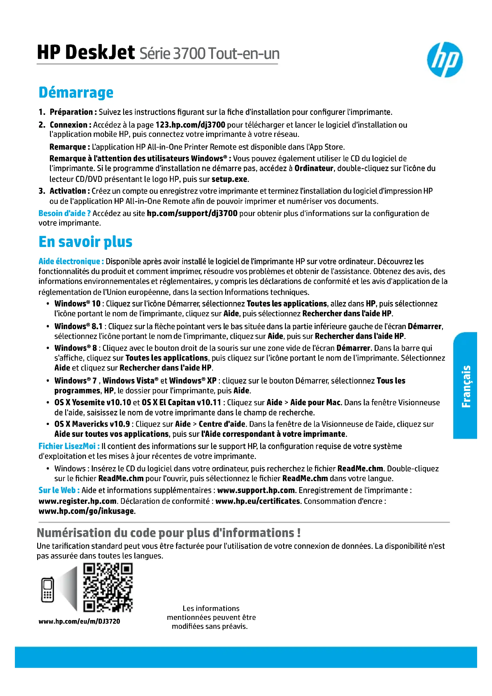 - Windows: Insérez le CD du logiciel dans votre ordinateur, puis recherchez le chier ReadMe.chm. Double-cliquez sur le chier ReadMe.chm pour l'ouvrir, puis sélectionnez le chier ReadMe.chm dans votre langue. Sur le Web: Aide et informations supplémentaires: www.support.hp.com. Enregistrement de l'imprimante: www.register.hp.com. Déclaration de conformité: www.hp.eu/certicates. Consommation d'encre: www.hp.com/go/inkusage. HP DeskJet Série 3700 Tout-en-un Numérisation du code pour plus d'informations! Une tarication standard peut vous être facturée pour l'utilisation de votre connexion de données. La disponibilité n'est pas assurée dans toutes les langues.Les informations mentionnées peuvent être modiées sans préavis. Français14 Panneau de commande