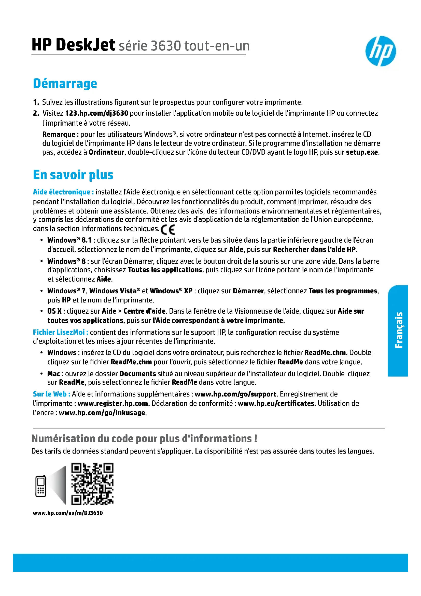 N'EXCLUENT, NE LIMITENT NI NE MODIFIENT LES DROITS STATUTAIRES OBLIGATOIRES APPLICABLES À LA VENTE DES PRODUITS HP AUXDITS CLIENTS, MAIS VIENNENT S'Y AJOUTER. Garantie du fabricant HP Vous trouverez, ci-après, les coordonnées de l’entité HP responsable de l'exécution de la garantie fabricant relative à votre matériel HP dans votre pays. France : En vertu de votre contrat d’achat, il se peut que vous disposiez de droits légaux supplémentaires à l’encontre de votre vendeur. Ceux-ci ne sont aucunement affectés par la présente garantie du fabricant HP. En particulier, si vous êtes un consommateur domicilié en France (départements et territoires d’outre-mer (DOM-TOM) inclus dans la limite des textes qui leur sont applicables), le vendeur reste tenu à votre égard des défauts de conformité du bien au contrat et des vices rédhibitoires dans les conditions prévues aux articles 1641 à 1649 du Code civil. Code de la consommation: " Art. L. 211-4. - Le vendeur est tenu de livrer un bien conforme au contrat et répond des défauts de conformité existant lors de la délivrance. - Il répond également des défauts de conformité résultant de l'emballage, des instructions de montage ou de l'installation lorsque celle-ci a été mise à sa charge par le contrat ou a été réalisée sous sa responsabilité. " " Art. L. 211-5. - Pour être conforme au contrat, le bien doit : 1° Etre propre à l'usage habituellement attendu d'un bien semblable et, le cas échéant correspondre à la description donnée par le vendeur et posséder les qualités que celui-ci a présentées à l'acheteur sous forme d'échantillon ou de modèle ; - présenter les qualités qu'un acheteur peut légitimement attendre eu égard aux déclarations publiques faites par le vendeur, par le producteur ou par son représentant, notamment dans la publicité ou l'étiquetage ; 2° Ou présenter les caractéristiques définies d'un commun accord par les parties ou être propre à tout usage spécial recherché par l'acheteur, porté à la connaissance du vendeur et que ce dernier a accepté. " " Art. L.211-12. – L’action résultant du défaut de conformité se prescrit par deux ans à compter de la délivrance du bien. " Code civil: " Code civil Article 1641 : Le vendeur est tenu de la garantie à raison des défauts cachés de la chose vendue qui la rendent impropre à l’usage auquel on la destine, ou qui diminuent tellement cet usage, que l’acheteur ne l’aurait pas acquise, ou n’en aurait donné qu’un moindre prix, s’il les avait connus. " " Code civil Article 1648 : L’action résultant des vices rédhibitoires doit être intentée par l’acquéreur dans un délai de deux ans à compter de la découverte du vice. " L’entité HP responsable de l'exécution de la garantie fabricant relative à votre matériel HP est : Hewlett-Packard France SAS, 1 Avenue du Canada 91947 LES ULIS Belgique : En vertu de votre contrat d’achat, il se peut que vous disposiez de droits légaux supplémentaires à l’encontre de votre vendeur. Ceux-ci ne sont aucunement affectés par la présente garantie du fabricant HP. L’entité HP responsable de l'exécution de la garantie fabricant relative à votre matériel HP est : Hewlett-Packard Belgium BVBA /SPRL, Hermeslaan 1A, B-1831 Belgique. Luxembourg: En vertu de votre contrat d’achat, il se peut que vous disposiez de droits légaux supplémentaires à l’encontre de votre vendeur. Ceux-ci ne sont aucunement affectés par la présente garantie du fabricant HP. En particulier, si vous êtes un consommateur la présente garantie fabricant HP ne fait pas obstacle à l’application des dispositions de la loi du 21 avril 2004 relative à la garantie de conformité et des dispositions du Code civil relatives à la garantie. La durée de la garantie légale en vertu de la loi du 21 avril 2004 est de deux ans à compter de la délivrance du bien. L’entité HP responsable de l'exécution de la garantie fabricant relative à votre matériel HP est : Hewlett-Packard Luxembourg SCA, Vegacenter 75, Parc d'Activités Capellen, L-8308 Capellen Produit HP Durée de la garantie limitée Supports logiciels 90 jours Imprimante 1 an Cartouches d'encre Jusqu'à épuisement de l'encre HP ou jusqu'à expiration de la date de garantie imprimée sur la cartouche (selon le cas qui se produira en premier). Cette garantie ne couvre pas les produits utilisant de l'encre HP qui ont été reconditionnés, mal utilisés ou altérés. Têtes d'impression (ne s'applique qu'aux produits avec 1 an des têtes d'impression pouvant être remplacées par le client) Accessoires 1 an, sauf indication contraire Françaiswww.hp.com/eu/m/DJ3630 Scopri di più con la scansione! Potrebbero essere in vigore le tarie dati standard. Potrebbe non essere disponibile in tutte le lingue. Ulteriori informazioni Guida in formato elettronico: installare la guida in formato elettronico selezionandola dal software consigliato durante la procedura di installazione. È possibile trovare informazioni sulle funzionalità dei prodotti, sulla stampa, sulla risoluzione dei problemi e sul supporto. Avvisi, requisiti ambientali e informazioni sulle normative, inclusi l’Avviso normativo per l’Unione Europea e le dichiarazioni di conformità, sono disponibili nella sezione Informazioni tecniche.