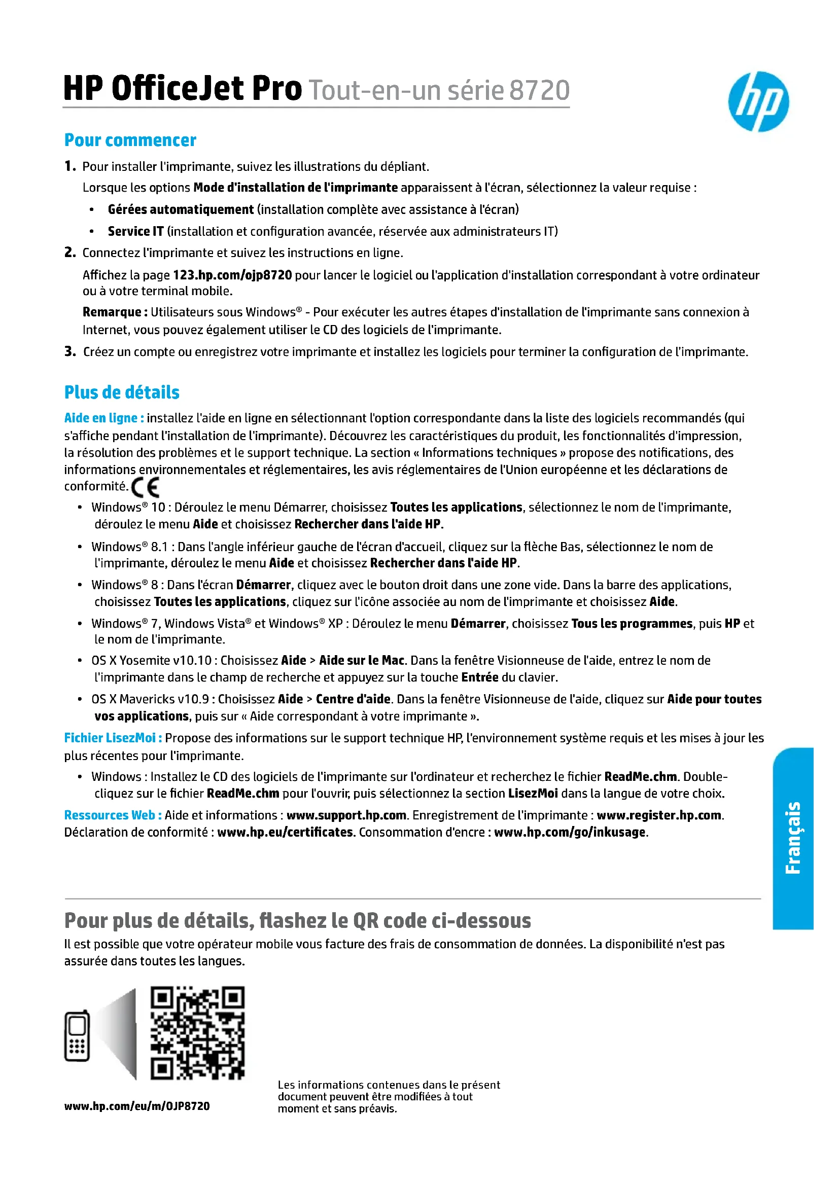 Aichez la page 123.hp.com/ojp8720 pour lancer le logiciel ou l'application d'installation correspondant à votre ordinateur ou à votre terminal mobile. Remarque: Utilisateurs sous Windows® - Pour exécuter les autres étapes d'installation de l'imprimante sans connexion à Internet, vous pouvez également utiliser le CD des logiciels de l'imprimante. 3. Créez un compte ou enregistrez votre imprimante et installez les logiciels pour terminer la conguration de l’imprimante. Plus de détails Aide en ligne: installez l'aide en ligne en sélectionnant l'option correspondante dans la liste des logiciels recommandés (qui s'aiche pendant l'installation de l'imprimante). Découvrez les caractéristiques du produit, les fonctionnalités d'impression, la résolution des problèmes et le support technique. La section « Informations techniques » propose des notications, des informations environnementales et réglementaires, les avis réglementaires de l'Union européenne et les déclarations de conformité.
