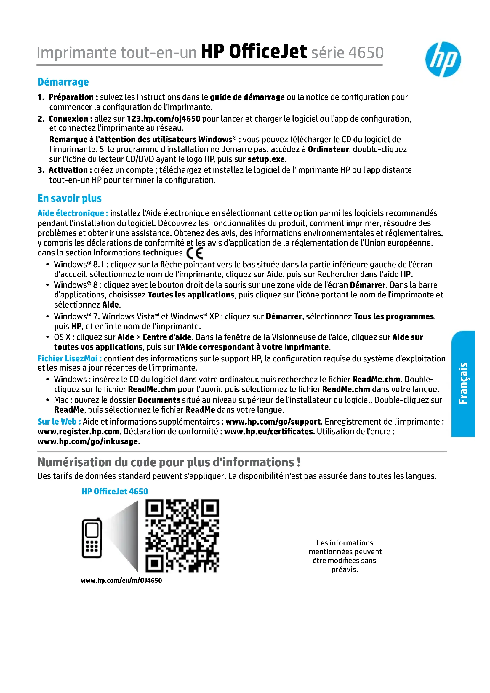 tout-en-un HP pour terminer la conguration. Imprimante tout-en-un HP OiceJet série 4650 Français Les informations mentionnées peuvent être modiées sans préavis.www.hp.com/eu/m/OJ4650HP OiceJet 465022 Informations de sécurité Respectez toujours les précautions de sécurité élémentaires quand vous utilisez cette imprimante an de réduire les risques de blessures dues au feu ou d'électrocution.