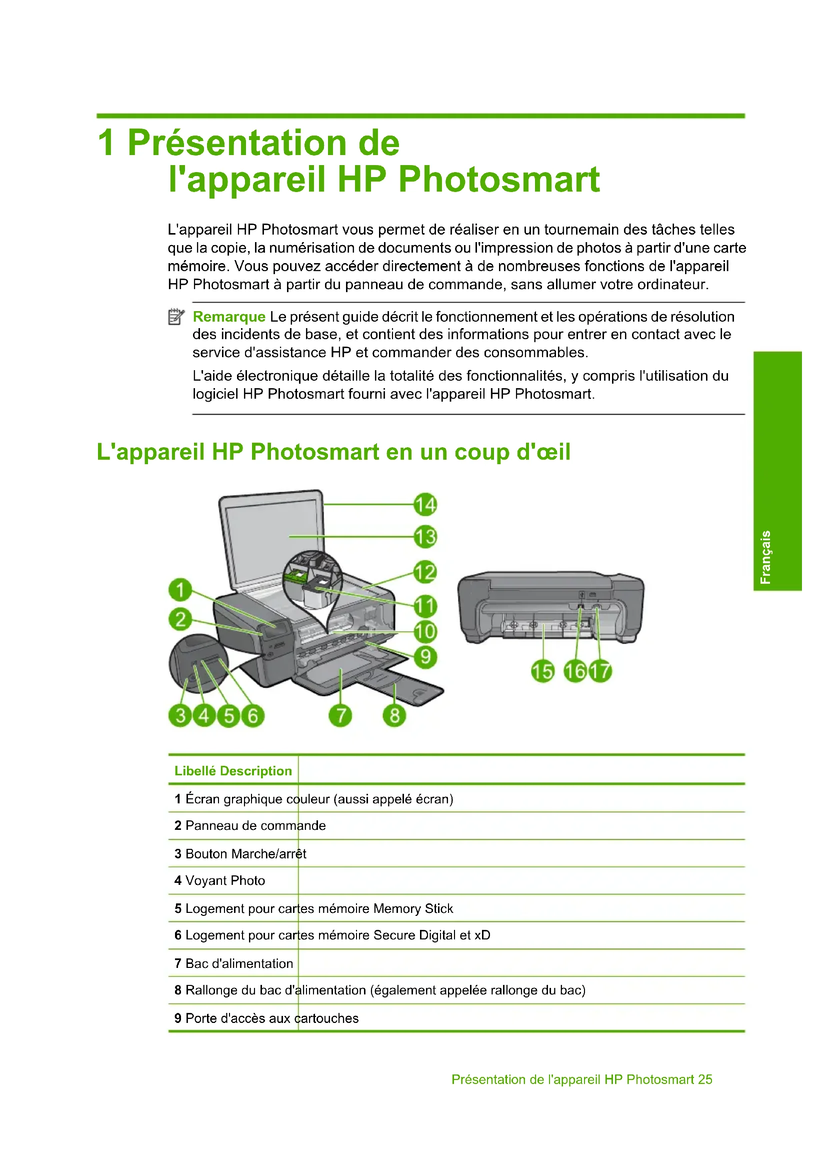 - Garantie 24 Tout-en-un HP Photosmart série C4600 Français1 Présentation de l'appareil HP Photosmart L'appareil HP Photosmart vous permet de réaliser en un tournemain des tâches telles que la copie, la numérisation de documents ou l'impression de photos à partir d'une carte mémoire. Vous pouvez accéder directement à de nombreuses fonctions de l'appareil HP Photosmart à partir du panneau de commande, sans allumer votre ordinateur. Remarque Le présent guide décrit le fonctionnement et les opérations de résolution des incidents de base, et contient des informations pour entrer en contact avec le service d'assistance HP et commander des consommables. L'aide électronique détaille la totalité des fonctionnalités, y compris l'utilisation du logiciel HP Photosmart fourni avec l'appareil HP Photosmart. L'appareil HP Photosmart en un coup d'œil Libellé Description 1 Écran graphique couleur (aussi appelé écran) 2 Panneau de commande 3 Bouton Marche/arrêt 4 Voyant Photo 5 Logement pour cartes mémoire Memory Stick 6 Logement pour cartes mémoire Secure Digital et xD 7 Bac d'alimentation 8 Rallonge du bac d'alimentation (également appelée rallonge du bac) 9 Porte d'accès aux cartouches Présentation de l'appareil HP Photosmart 25 FrançaisLibellé Description 10 Zone d'accès aux cartouches 11 Chariot d'impression 12 Vitre 13 Intérieur du capot 14 Capot 15 Porte arrière 16 Port USB arrière 17 Raccordement électrique (utilisez exclusivement l'adaptateur secteur fourni par HP). Boutons du panneau de commande Le schéma et le tableau associé suivants décrivent brièvement les caractéristiques du panneau de commande de l'appareil HP Photosmart. p. 44