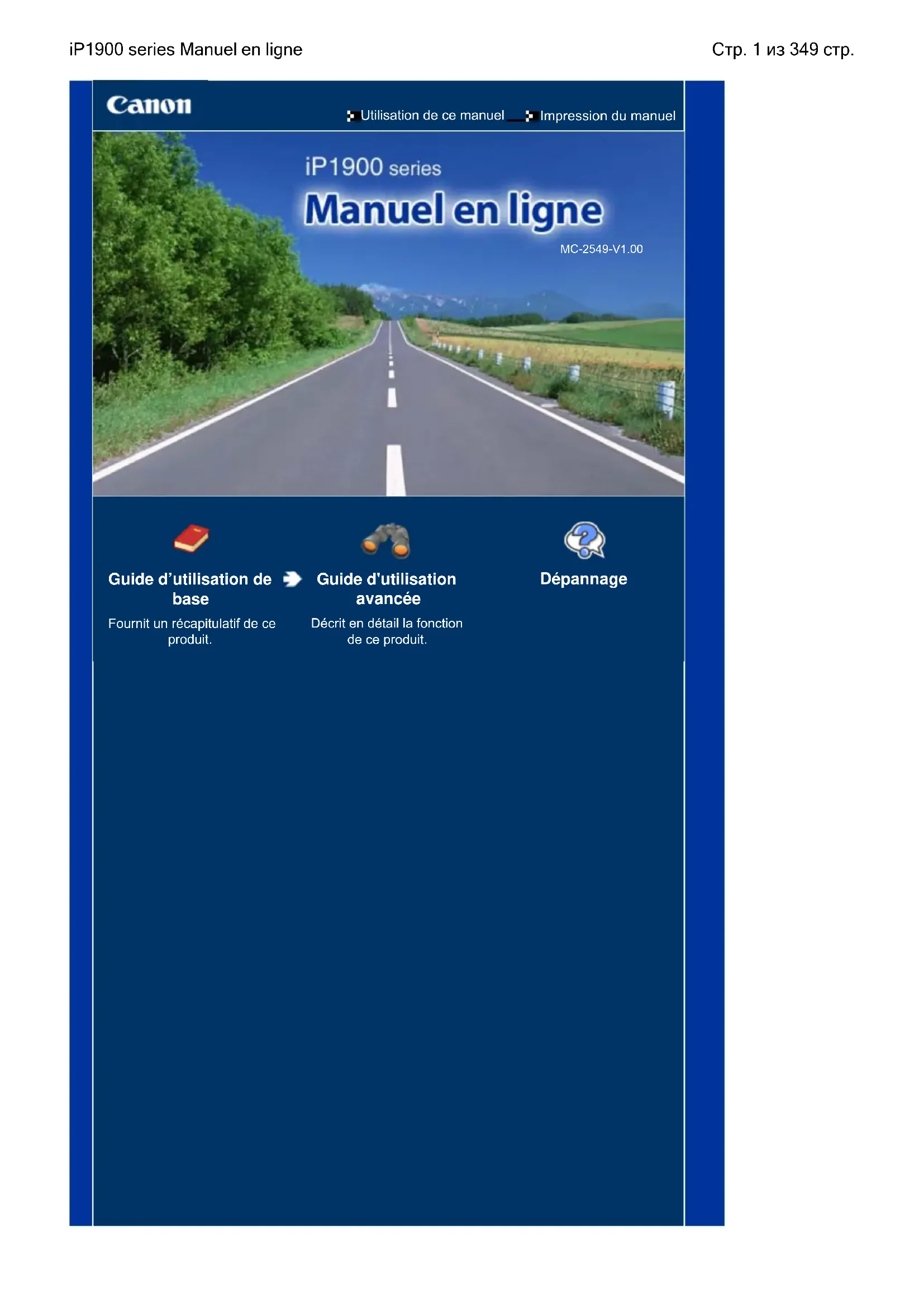 Utilisation de ce manuelImpression du manuelMC-2549-V1.00 Guide d’utilisation de base Fournit un récapitulatif de ceproduit. Guide d'utilisation avancée Décrit en détail la fonctionde ce produit. Dépannage Стр. 1 из 349 стр.iP1900 series Manuel en ligneUtilisation de ce manuel Impression du manuel MP-2058-V1.00Guide d'utilisation avancée Contenu Présentation de l’imprimante Principaux composants Impression Impression de photos (Easy-PhotoPrint EX)Impression de documents (Windows)Impression de documents (Macintosh) Encore plus d'utilitaires Solution Menu et My Printer Chargement du papier Chargement du papier Procédures d'entretien L'impression devient pâle ou les couleurs nes'impriment plus correctementRemplacement d'une cartouche FINENettoyage du rouleau d'entraînement du papier Ouverture des écrans Entretien Annexe Précautions de sécuritéConditions légales d'utilisation de ce produit et des images Conseils d'utilisation de l'imprimante Стр. 2 из 349 стр.iP1900 series - Guide d'utilisation de baseGuide d'utilisation avancée DépannageContenu > Présentation de l'imprimante Présentation de l’imprimante Cette section présente les noms des composants de l'imprimante et décrit leurs fonctions. Principaux composants Face avant Face arrière Vue de l’intérieur