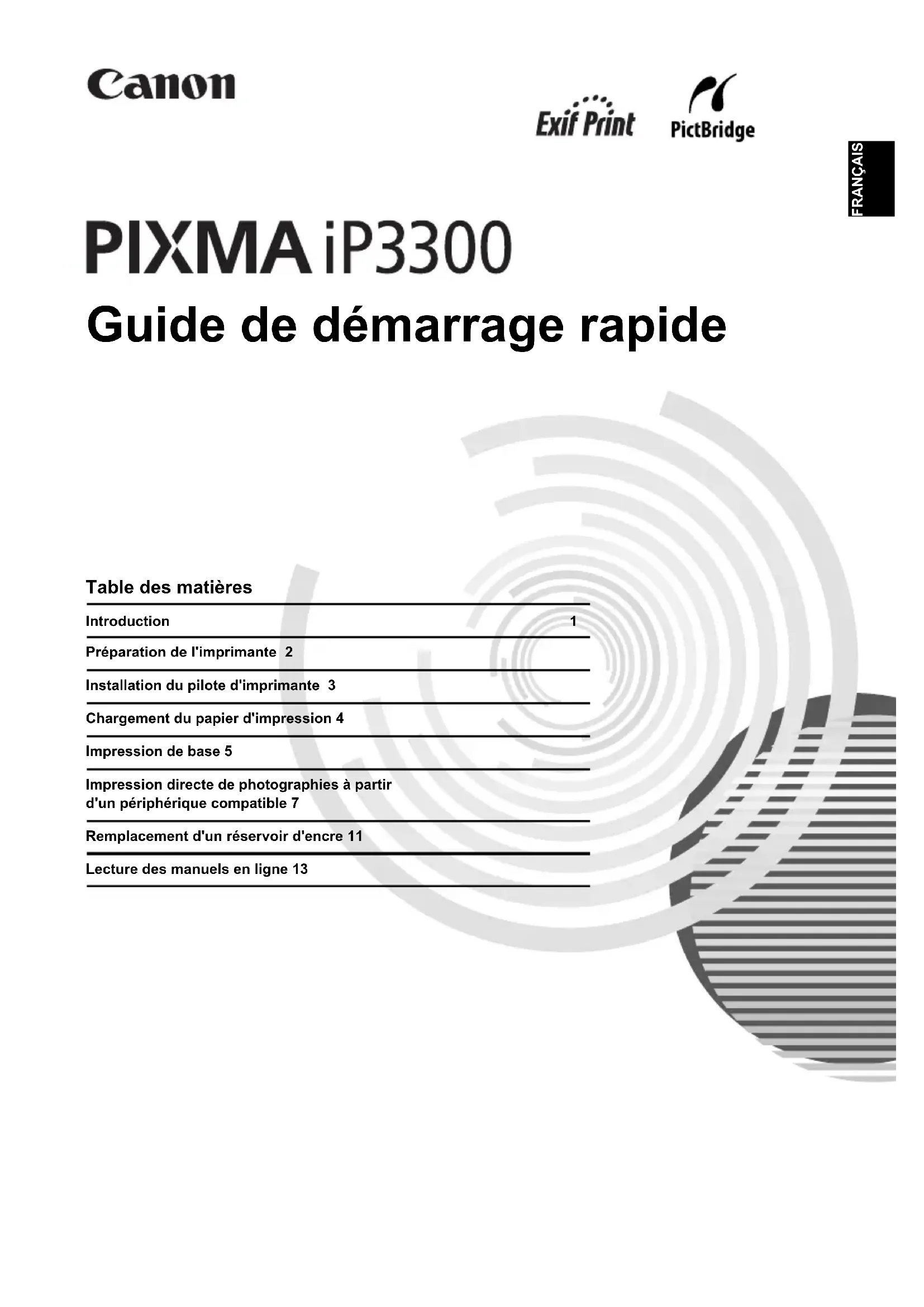 Avertissement z N'essayez jamais de brancher le câble d'alimentation sur la prise de courant ou de le débrancher si vos mains sont mouillées. z Veillez à ne jamais endommager, modifier, étirer, plier ou tordre de façon excessive le câble d'alimentation. Ne placez pas d'objets lourds sur le câble d'alimentation. z N'utilisez jamais de source d'alimentation autre que celle fournie dans le pays d'achat. L'utilisation d'une tension et d'une fréquence incorrectes risque de causer un incendie ou une décharge électrique.z Veillez à toujours enfoncer totalement la fiche dans la prise de courant. Attention z Pour des raisons de sécurité, gardez les têtes d'impression et les réservoirs d'encre hors de portée des jeunes enfants. z Ne laissez pas tomber les réservoirs d'encre et ne les remuez pas, car l'encre risque de couler et de tacher vos vêtements et vos mains. Lisez également les précautions de sécurité dans le manuel en ligne Guide d'Utilisation. Prêtez attention aux avertissements et précautions de sécurité afin de ne pas vous blesser ou endommager l'imprimante. Numéro de modèle : K10280 (iP3300)1 Introduction FRANÇAIS Introduction Nous vous remercions d'avoir acquis une imprimante à jet d'encre Canon. Ce Guide de démarrage rapide utilise les symboles suivants pour signaler les informations importantes. Observez toujours les instructions indiquées par ces symboles. Avertissement Instructions dont le non-respect peut entraîner des risques très graves ou des blessures graves causées par un fonctionnement incorrect du matériel. À respecter pour garantir un fonctionnement en toute sécurité. Attention Instructions dont le non-respect peut entraîner des blessures graves ou des dommages matériels causés par un fonctionnement incorrect du matériel. À respecter pour garantir un fonctionnement en toute sécurité. Important Instruction à respecter pour garantir un fonctionnement en toute sécurité. Remarques relatives aux marques z « Windows » et « Internet Explorer » sont des marques de Microsoft Corporation, déposées aux États-Unis et dans d'autres pays. z « Macintosh » et « Mac » sont des marques d'Apple Computer, Inc., déposées aux États-Unis et dans d'autres pays. z « Adobe » et « Adobe RGB (1998) » sont des marques ou des marques déposées de Adobe Systems Incorporated aux États-Unis et/ou dans d'autres pays. Copyright ©2006 CANON INC. Tous droits réservés. Toute reproduction ou transmission, même partielle, sous quelque forme que ce soit, est interdite sans autorisation expresse écrite.2 Préparation de l'imprimante FRANÇAIS Préparation de l'imprimante Lisez attentivement les instructions d’installation simplifiée (Fiche d'installation) avant d'installer l'imprimante et de la mettre en service. 1 Allumez l'imprimante. 2 Installez la tête d'impression. 3 Installez les réservoirs d'encre. Attention N'oubliez pas d'enlever les rubans adhésifs avant d'allumer l'imprimante. Remarque z La position du ruban adhésif peut varier. z Veillez à ce que le cordon d'alimentation soit bien enfoncé, car il peut être difficile à brancher. Attention Ne touchez pas à des composants internes autres que le levier de verrouillage de la tête d'impression. Important Si le capot supérieur reste ouvert pendant plus de 10 minutes, le support de la tête d'impression se place sur la droite. Dans ce cas, fermez le capot supérieur puis rouvrez-le. Remarque z L'intérieur de l'emballage de la tête d'impression ou de sa capsule de protection orange peut être taché d'encre bleu clair ; cela n'affecte pas la qualité d'impression. Faites toutefois attention à ne pas souiller vos mains ou vos vêtements lorsque vous les manipulez.z Ne remettez pas la capsule de protection une fois que celle-ci a été enlevée. Important z Vérifiez que tous les réservoirs d'encre sont correctement installés conformément à l'indication de l'étiquette. L'imprimante ne peut être utilisée que si tous les réservoirs d'encre sont en place. z Une fois ceux-ci installés, le témoin [POWER] (ALIMENTATION) clignote vert. Attendez environ 2 minutes, que le témoin [POWER] (ALIMENTATION) arrête de clignoter et devienne vert fixe et que l'imprimante ne fasse plus de bruit, avant de continuer. Remarque z Veillez à retirer le film transparent du réservoir d'encre dans l'ordre exact indiqué à l'étape 3 des instructions d’installation simplifiée (Fiche d'installation). z N'appuyez pas sur les côtés des réservoirs d'encre car l'encre risque de couler et de tacher vos vêtements et vos mains.z Ne remettez pas la capsule de protection en place après l'avoir retirée. z Si un réservoir d'encre est mal installé, le témoin [ALARM] (ALARME) orange de l'imprimante continue de clignoter. Ouvrez le capot supérieur et vérifiez que chacun des réservoirs d'encre est installé conformément à l'indication de l'étiquette.3 Installation du pilote d'imprimante FRANÇAIS Installation du pilote d'imprimante Informations communes à Windows