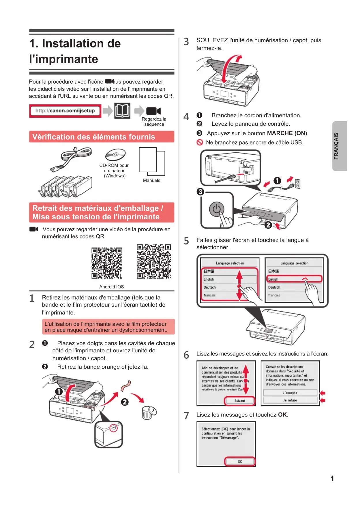 l'imprimante Pour la procédure avec l'icône , vous pouvez regarder les didacticiels vidéo sur l'installation de l'imprimante en accédant à l'URL suivante ou en numérisant les codes QR. Regardez la séquence Vérication des éléments fournis CD-ROM pour ordinateur (Windows)Manuels Retrait des matériaux d'emballage / Mise sous tension de l'imprimante Vous pouvez regarder une vidéo de la procédure en numérisant les codes QR. Android iOS