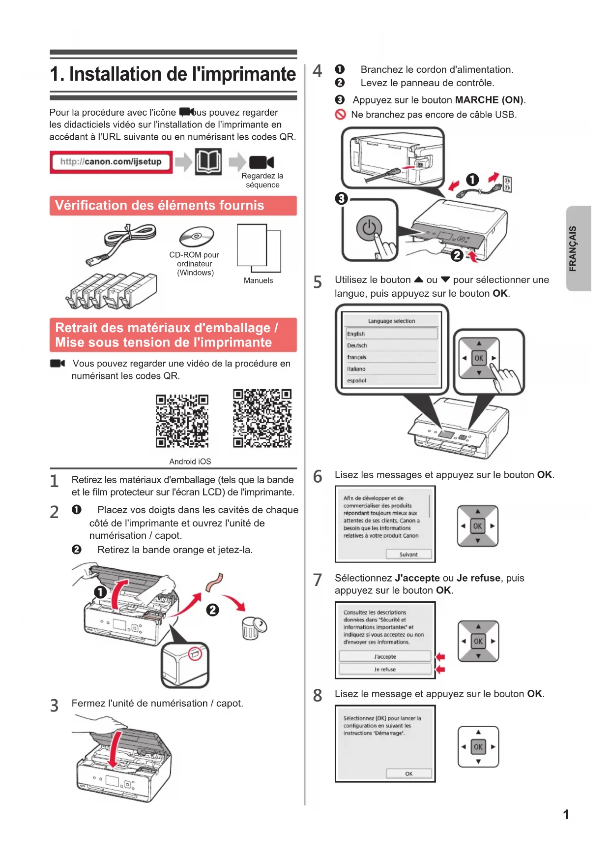 Lisez le message et appuyez sur le bouton OK.2 Installation de la cartouche d'encre Vous pouvez regarder une vidéo de la procédure en numérisant les codes QR. Android iOS
