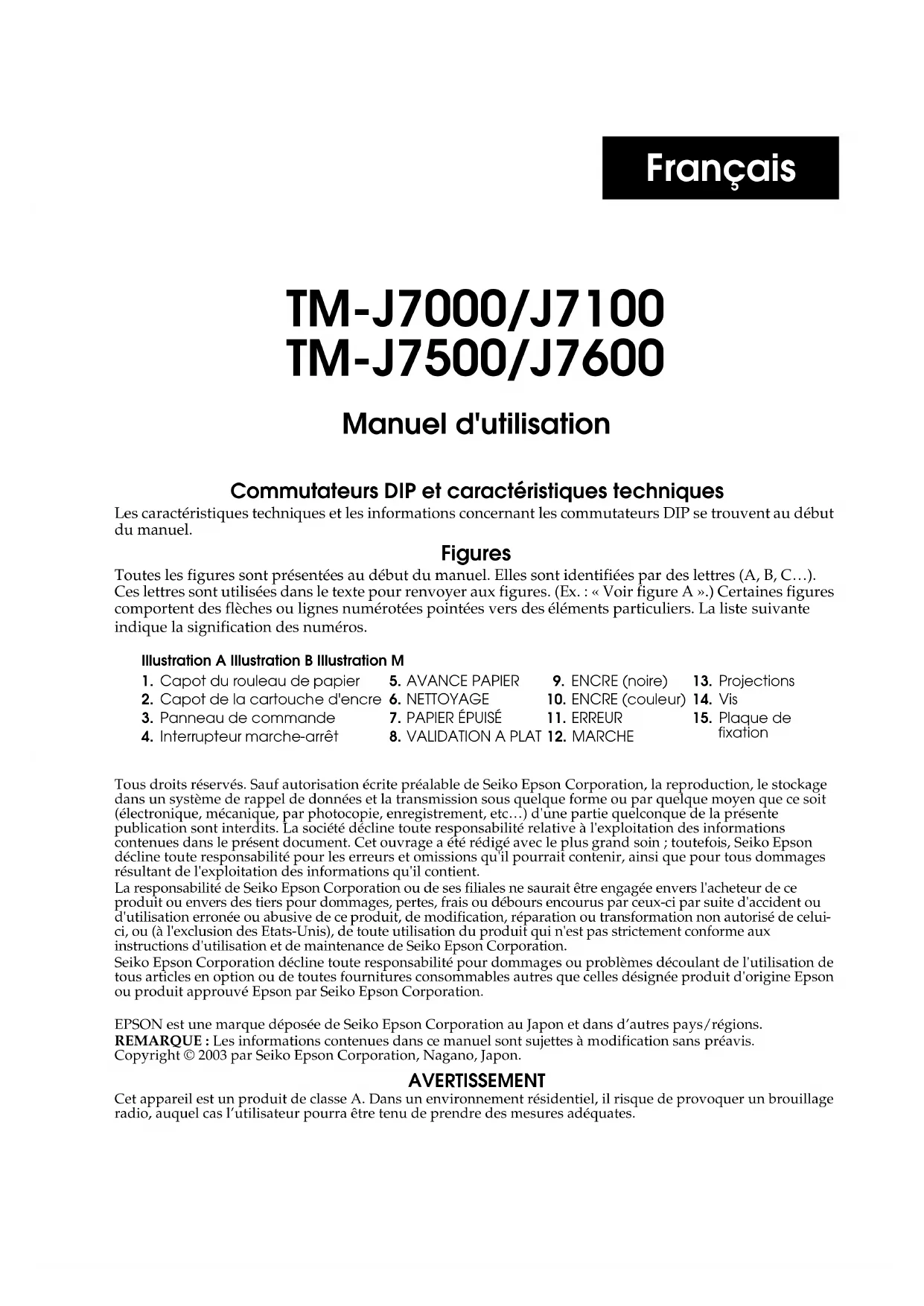 - Lees de informatie op het etiket van de netspanningsadapter (vermogen, waarschuwingen enzovoort) goed door en weet wat deze informatie inhoudt, voordat u de netspanningsadapter in de printer inbouwt.Français TM-J7000/J7100 TM-J7500/J7600 Manuel d'utilisation Commutateurs DIP et caractéristiques techniques Les caractéristiques techniques et les informations concernant les commutateurs DIP se trouvent au début du manuel. Figures Toutes les figures sont présentées au début du manuel. Elles sont identifiées par des lettres (A, B, C…). Ces lettres sont utilisées dans le texte pour renvoyer aux figures. (Ex. : « Voir figure A ».) Certaines figures comportent des flèches ou lignes numérotées pointées vers des éléments particuliers. La liste suivante indique la signification des numéros. Tous droits réservés. Sauf autorisation écrite préalable de Seiko Epson Corporation, la reproduction, le stockage dans un système de rappel de données et la transmission sous quelque forme ou par quelque moyen que ce soit (électronique, mécanique, par photocopie, enregistrement, etc…) d'une partie quelconque de la présente publication sont interdits. La société décline toute responsabilité relative à l'exploitation des informations contenues dans le présent document. Cet ouvrage a été rédigé avec le plus grand soin ; toutefois, Seiko Epson décline toute responsabilité pour les erreurs et omissions qu'il pourrait contenir, ainsi que pour tous dommages résultant de l'exploitation des informations qu'il contient. La responsabilité de Seiko Epson Corporation ou de ses filiales ne saurait être engagée envers l'acheteur de ce produit ou envers des tiers pour dommages, pertes, frais ou débours encourus par ceux-ci par suite d'accident ou d'utilisation erronée ou abusive de ce produit, de modification, réparation ou transformation non autorisé de celui- ci, ou (à l'exclusion des Etats-Unis), de toute utilisation du produit qui n'est pas strictement conforme aux instructions d'utilisation et de maintenance de Seiko Epson Corporation. Seiko Epson Corporation décline toute responsabilité pour dommages ou problèmes découlant de l'utilisation de tous articles en option ou de toutes fournitures consommables autres que celles désignée produit d'origine Epson ou produit approuvé Epson par Seiko Epson Corporation. EPSON est une marque déposée de Seiko Epson Corporation au Japon et dans d’autres pays/régions. REMARQUE : Les informations contenues dans ce manuel sont sujettes à modification sans préavis. Copyright © 2003 par Seiko Epson Corporation, Nagano, Japon. AVERTISSEMENT Cet appareil est un produit de classe A. Dans un environnement résidentiel, il risque de provoquer un brouillage radio, auquel cas l’utilisateur pourra être tenu de prendre des mesures adéquates.Illustration A Illustration B Illustration M