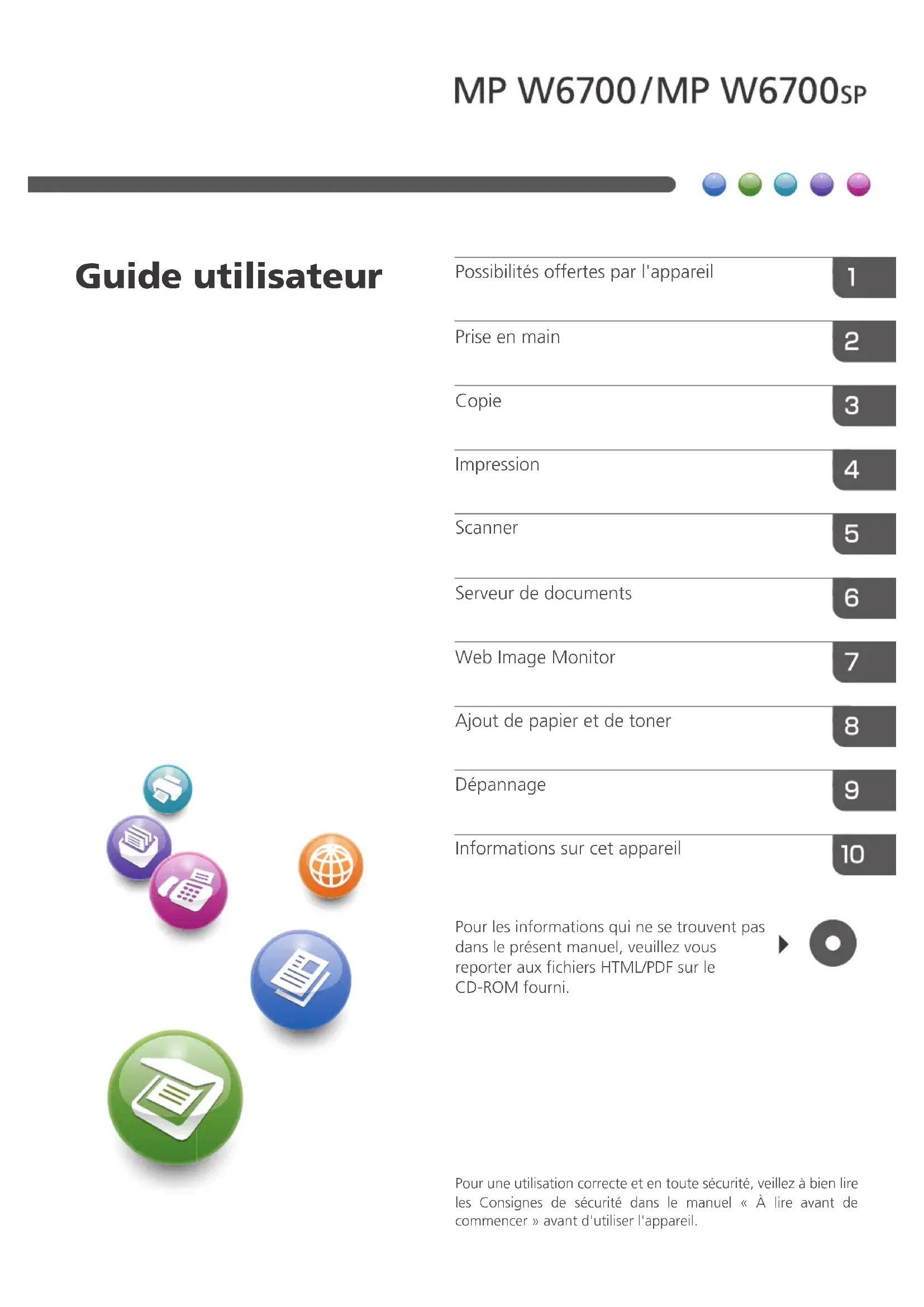 Pour une utilisation correcte et en toute sécurité, veillez à bien lire les Consignes de sécurité dans le manuel « À lire avant de commencer» avant d'utiliser l'appareil. Pour les informations qui ne se trouvent pas dans le présent manuel, veuillez vous reporter aux fichiers HTML/PDF sur le CD-ROM fourni. Informations sur cet appareil Dépannage Ajout de papier et de toner Web Image Monitor Serveur de documents Scanner Impression Copie Prise en main Possibilités offertes par l'appareil Guide utilisateurTABLE DES MATIÈRES Comment lire les manuels.................................................................................................................................. 6 Symboles utilisés dans les manuels...............................................................................................................6 Informations spécifiques au modèle..................................................................................................................7