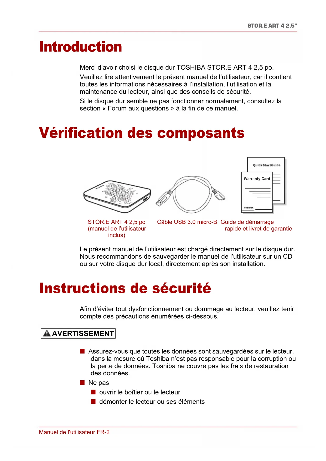 Introduction Merci d’avoir choisi le disque dur TOSHIBA STOR.E ART 4 2,5 po. Veuillez lire attentivement le présent manuel de l’utilisateur, car il contient toutes les informations nécessaires à l’installation, l’utilisation et la maintenance du lecteur, ainsi que des conseils de sécurité. Si le disque dur semble ne pas fonctionner normalement, consultez la section « Forum aux questions » à la fin de ce manuel. Vérification des composants Le présent manuel de l’utilisateur est chargé directement sur le disque dur. Nous recommandons de sauvegarder le manuel de l’utilisateur sur un CD ou sur votre disque dur local, directement après son installation. Instructions de sécurité Afin d’éviter tout dysfonctionnement ou dommage au lecteur, veuillez tenir compte des précautions énumérées ci-dessous. ■ Assurez-vous que toutes les données sont sauvegardées sur le lecteur, dans la mesure où Toshiba n’est pas responsable pour la corruption ou la perte de données. Toshiba ne couvre pas les frais de restauration des données. ■ Ne pas ■ ouvrir le boîtier ou le lecteur ■ démonter le lecteur ou ses éléments Warranty Card STOR.E ART 4 2,5 po (manuel de l’utilisateur inclus) Câble USB 3.0 micro-B Guide de démarrage rapide et livret de garantie AVERTISSEMENTManuel de l'utilisateur FR-3