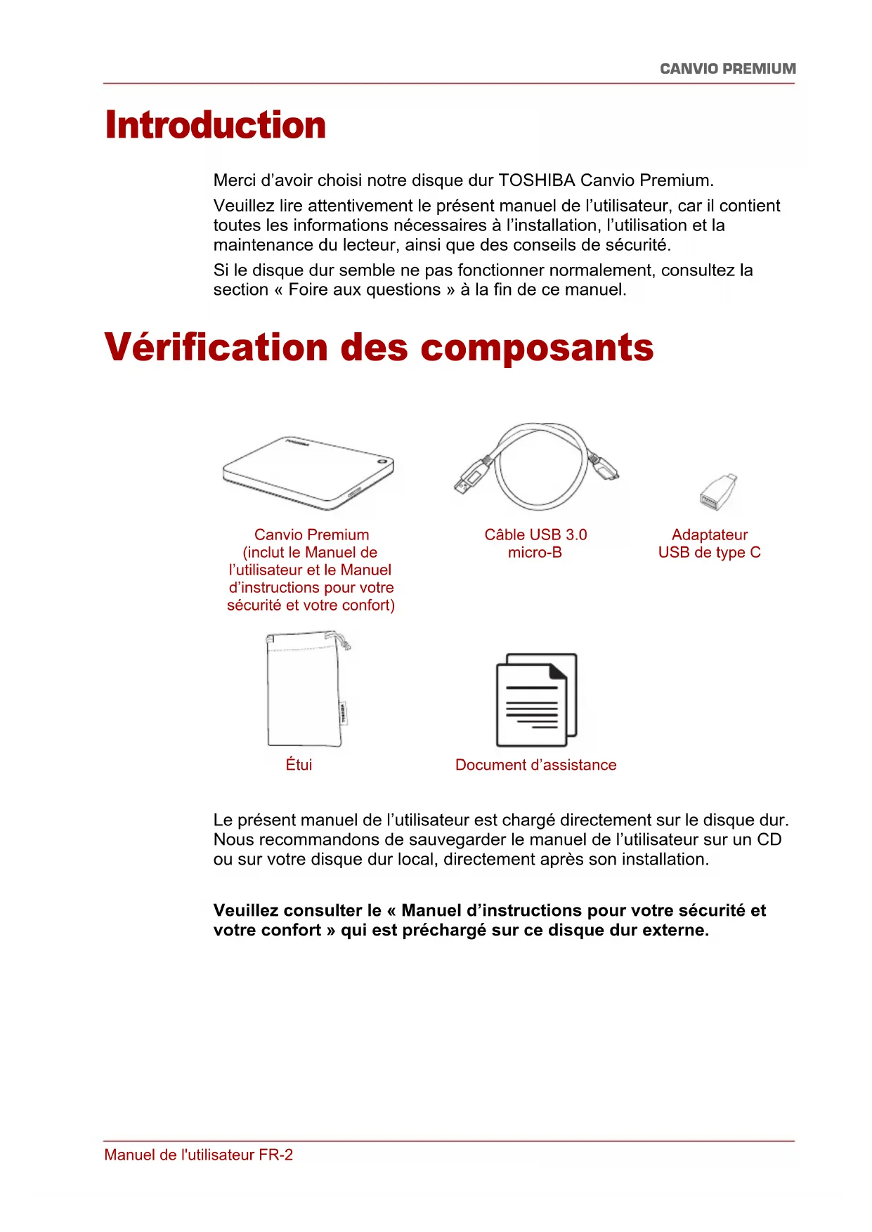 - Règlements Manuel de l'utilisateur FR-2 CANVIO PREMIUM Introduction Merci d’avoir choisi notre disque dur TOSHIBA Canvio Premium. Veuillez lire attentivement le présent manuel de l’utilisateur, car il contient toutes les informations nécessaires à l’installation, l’utilisation et la maintenance du lecteur, ainsi que des conseils de sécurité. Si le disque dur semble ne pas fonctionner normalement, consultez la section « Foire aux questions » à la fin de ce manuel. Vérification des composants Le présent manuel de l’utilisateur est chargé directement sur le disque dur. Nous recommandons de sauvegarder le manuel de l’utilisateur sur un CD ou sur votre disque dur local, directement après son installation. Veuillez consulter le « Manuel d’instructions pour votre sécurité et votre confort » qui est préchargé sur ce disque dur externe. Canvio Premium (inclut le Manuel de l’utilisateur et le Manuel d’instructions pour votre sécurité et votre confort) Câble USB 3.0 micro-B Étui Adaptateur USB de type C Document d’assistanceManuel de l'utilisateur FR-3 CANVIO PREMIUM Configuration requise ■ Windows p. 8