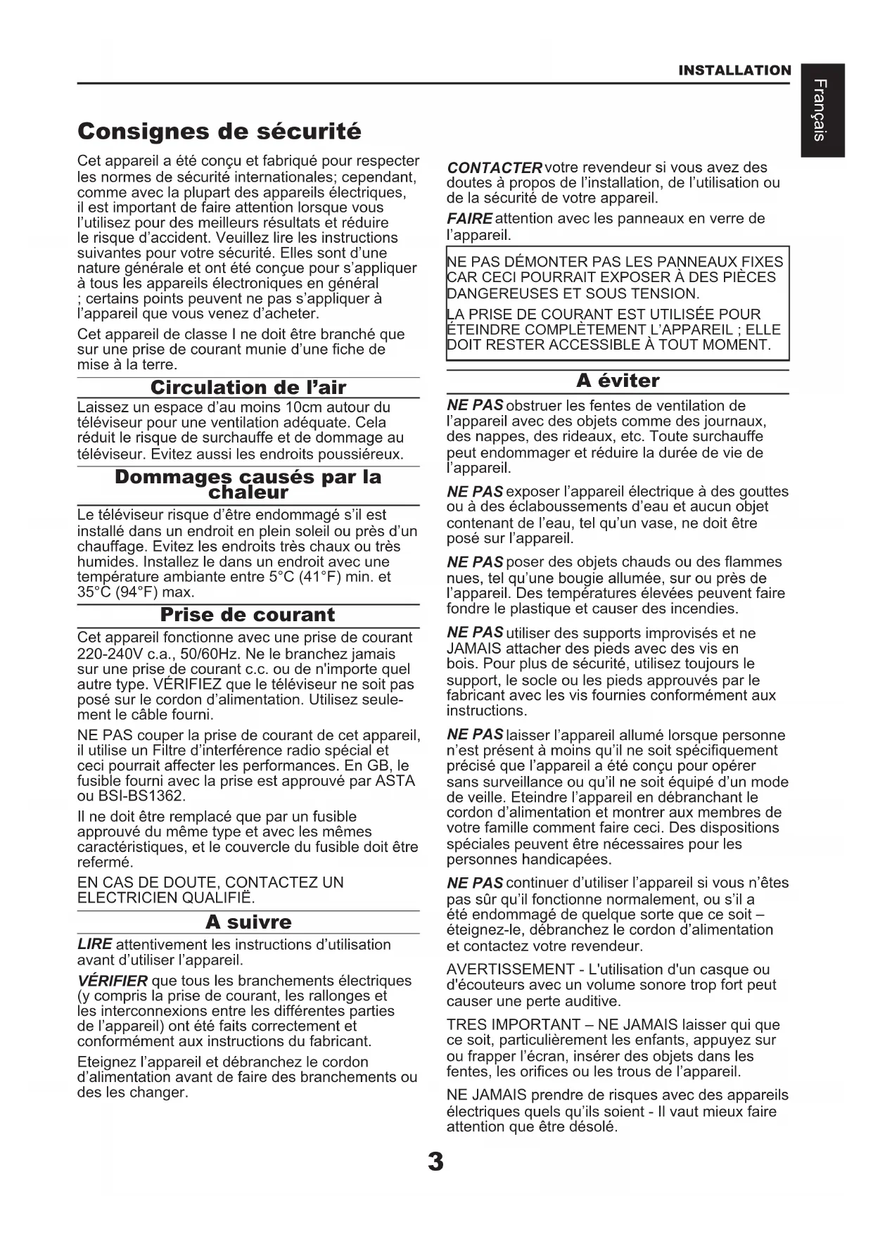 ELECTRICIEN QUALIFIË. A suivre LIRE attentivement les instructions d’utilisation avant d’utiliser l’appareil. VÉRIFIER que tous les branchements électriques (y compris la prise de courant, les rallonges et les interconnexions entre les différentes parties de l’appareil) ont été faits correctement et conformément aux instructions du fabricant. Eteignez l’appareil et débranchez le cordon d’alimentation avant de faire des branchements ou des les changer. CONTACTER votre revendeur si vous avez des doutes à propos de l’installation, de l’utilisation ou de la sécurité de votre appareil. FAIRE attention avec les panneaux en verre de l’appareil. A éviter NE PAS obstruer les fentes de ventilation de l’appareil avec des objets comme des journaux, des nappes, des rideaux, etc. Toute surchauffe peut endommager et réduire la durée de vie de l’appareil. NE PAS exposer l’appareil électrique à des gouttes ou à des éclaboussements d’eau et aucun objet contenant de l’eau, tel qu’un vase, ne doit être posé sur l’appareil. NE PAS poser des objets chauds ou des flammes nues, tel qu’une bougie allumée, sur ou près de l’appareil. Des températures élevées peuvent faire fondre le plastique et causer des incendies. NE PAS utiliser des supports improvisés et ne JAMAIS attacher des pieds avec des vis en bois. Pour plus de sécurité, utilisez toujours le support, le socle ou les pieds approuvés par le fabricant avec les vis fournies conformément aux instructions. NE PAS laisser l’appareil allumé lorsque personne n’est présent à moins qu’il ne soit spécifiquement précisé que l’appareil a été conçu pour opérer sans surveillance ou qu’il ne soit équipé d’un mode de veille. Eteindre l’appareil en débranchant le cordon d’alimentation et montrer aux membres de votre famille comment faire ceci. Des dispositions spéciales peuvent être nécessaires pour les personnes handicapées. NE PAS continuer d’utiliser l’appareil si vous n’êtes pas sûr qu’il fonctionne normalement, ou s’il a été endommagé de quelque sorte que ce soit – éteignez-le, débranchez le cordon d’alimentation et contactez votre revendeur. AVERTISSEMENT - L'utilisation d'un casque ou d'écouteurs avec un volume sonore trop fort peut causer une perte auditive. TRES IMPORTANT – NE JAMAIS laisser qui que ce soit, particulièrement les enfants, appuyez sur ou frapper l’écran, insérer des objets dans les fentes, les orifices ou les trous de l’appareil. NE JAMAIS prendre de risques avec des appareils électriques quels qu’ils soient - Il vaut mieux faire attention que être désolé. NE PAS DÉMONTER PAS LES PANNEAUX FIXES CAR CECI POURRAIT EXPOSER À DES PIÈCES DANGEREUSES ET SOUS TENSION.LA PRISE DE COURANT EST UTILISÉE POUR ÉTEINDRE COMPLÈTEMENT L’APPAREIL ; ELLE DOIT RESTER ACCESSIBLE À TOUT MOMENT.Français INSTALLATION