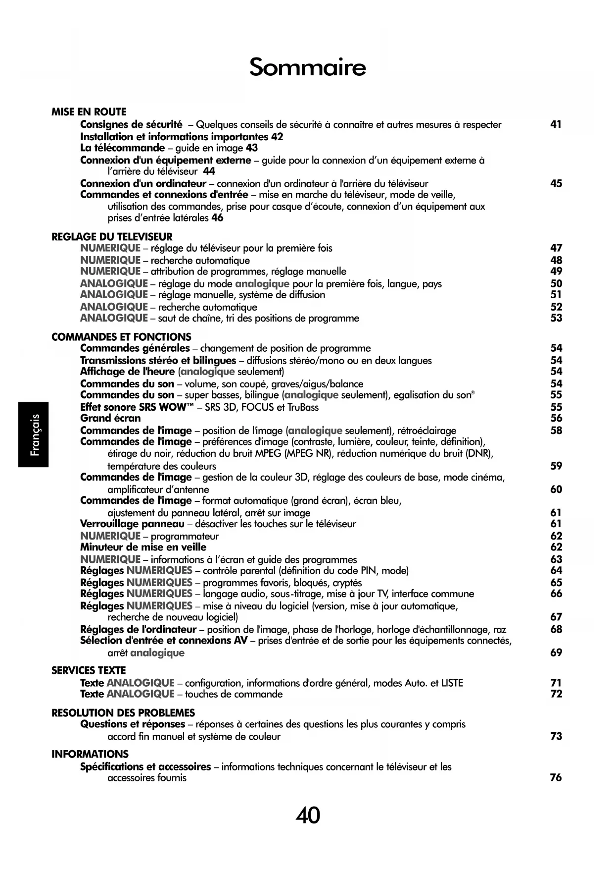 Effet sonore SRS WOW™ – SRS 3D, FOCUS et TruBass 55 Grand écran 56 Commandes de l'image – position de l'image (analogique seulement), rétroéclairage 58 Commandes de l'image – préférences d'image (contraste, lumière, couleur, teinte, définition), étirage du noir, réduction du bruit MPEG (MPEG NR), réduction numérique du bruit (DNR), température des couleurs 59 Commandes de l'image – gestion de la couleur 3D, réglage des couleurs de base, mode cinéma, amplificateur d’antenne 60 Commandes de l'image – format automatique (grand écran), écran bleu, ajustement du panneau latéral, arrêt sur image 61 Verrouillage panneau – désactiver les touches sur le téléviseur 61 NUMERIQUE – programmateur 62 Minuteur de mise en veille 62 NUMERIQUE – informations à l’écran et guide des programmes 63 Réglages NUMERIQUES – contrôle parental (définition du code PIN, mode) 64 Réglages NUMERIQUES – programmes favoris, bloqués, cryptés 65 Réglages NUMERIQUES – langage audio, sous-titrage, mise à jour TV, interface commune 66 Réglages NUMERIQUES – mise à niveau du logiciel (version, mise à jour automatique, recherche de nouveau logiciel) 67 Réglages de l'ordinateur – position de l'image, phase de l'horloge, horloge d'échantillonnage, raz 68 Sélection d'entrée et connexions AV – prises d'entrée et de sortie pour les équipements connectés, arrêt analogique 69 SERVICES TEXTE Texte ANALOGIQUE – configuration, informations d'ordre général, modes Auto. et LISTE 71 Texte ANALOGIQUE – touches de commande 72