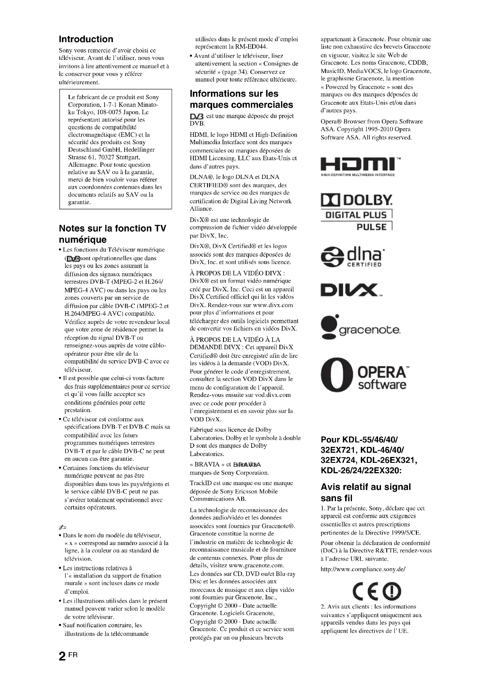 DEMANDE DIVX : Cet appareil DivX Certified® doit être enregistré afin de lire les vidéos à la demande (VOD) DivX. Pour générer le code d’enregistrement, consultez la section VOD DivX dans le menu de configuration de l’appareil. Rendez-vous ensuite sur vod.divx.com avec ce code pour procéder à l’enregistrement et en savoir plus sur la VOD DivX. Fabriqué sous licence de Dolby Laboratories. Dolby et le symbole à double D sont des marques de Dolby Laboratories. « BRAVIA » et sont des marques de Sony Corporation. TrackID est une marque ou une marque déposée de Sony Ericsson Mobile Communications AB. La technologie de reconnaissance des données audio/vidéo et les données associées sont fournies par Gracenote®. Gracenote constitue la norme de l’industrie en matière de technologie de reconnaissance musicale et de fourniture de contenus connexes. Pour plus de détails, visitez www.gracenote.com. Les données sur CD, DVD ou/et Blu-ray Disc et les données associées aux morceaux de musique et aux clips vidéo sont fournies par Gracenote, Inc., Copyright © 2000 - Date actuelle Gracenote. Logiciels Gracenote, Copyright © 2000 - Date actuelle Gracenote. Ce produit et ce service sont protégés par un ou plusieurs brevets appartenant à Gracenote. Pour obtenir une liste non exhaustive des brevets Gracenote en vigueur, visitez le site Web de Gracenote. Les noms Gracenote, CDDB, MusicID, MediaVOCS, le logo Gracenote, le graphisme Gracenote, la mention « Powered by Gracenote » sont des marques ou des marques déposées de Gracenote aux Etats-Unis et/ou dans d’autres pays. Opera® Browser from Opera Software ASA. Copyright 1995-2010 Opera Software ASA. All rights reserved. Pour KDL-55/46/40/ 32EX721, KDL-46/40/ 32EX724, KDL-26EX321, KDL-26/24/22EX320: Avis relatif au signal sans fil