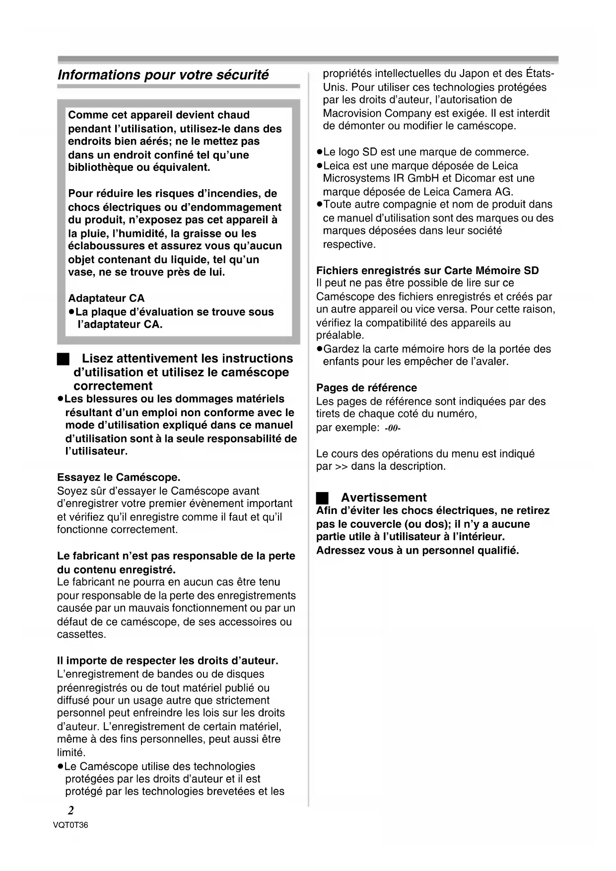- Le cours des opérations du menu est indiqué par >> dans la description. ª Avertissement Afin d’éviter les chocs électriques, ne retirez pas le couvercle (ou dos); il n’y a aucune partie utile à l’utilisateur à l’intérieur. Adressez vous à un personnel qualifié. Comme cet appareil devient chaud pendant l’utilisation, utilisez-le dans des endroits bien aérés; ne le mettez pas dans un endroit confiné tel qu’une bibliothèque ou équivalent. Pour réduire les risques d’incendies, de chocs électriques ou d’endommagement du produit, n’exposez pas cet appareil à la pluie, l’humidité, la graisse ou les éclaboussures et assurez vous qu’aucun objet contenant du liquide, tel qu’un vase, ne se trouve près de lui. Adaptateur CA ≥La plaque d’évaluation se trouve sous l’adaptateur CA. VQT0T36_FRA.book 2 ページ 2005年12月16日 金曜日 午後1時16分3 VQT0T36 ª EMC Compatibilité Électrique et magnétique Ce symbole (CE) est placé sur la plaque d’évaluation. Utilisez uniquement les accessoires recommandés. ≥N’utilisez aucun autre Câble multi et câbles USB que ceux fournis. ≥Si vous utilisez des câbles achetés séparément, assurez-vous d’en utiliser un d’une longueur de moins de 3 mètres. Informations relatives à l’évacuation des déchets, destinées aux utilisateurs d’appareils électriques et électroniques (appareils ménagers domestiques) Lorsque ce symbole figure sur les produits et/ou les documents qui les accompagnent, cela signifie que les appareils électriques et électroniques ne doivent pas être jetés avec les ordures ménagères. Pour que ces produits subissent un traitement, une récupération et un recyclage appropriés, envoyez-les dans les points de collecte désignés, où ils peuvent être déposés gratuitement. Dans certains pays, il est possible de renvoyer les produits au revendeur local en cas d’achat d’un produit équivalent. En éliminant correctement ce produit, vous contribuerez à la conservation des ressources vitales et à la prévention des éventuels effets négatifs sur l’environnement et la santé humaine qui pourraient survenir dans le cas contraire. Afin de connaître le point de collecte le plus proche, veuillez contacter vos autorités locales. Des sanctions peuvent être appliquées en cas d’élimination incorrecte de ces déchets, conformément à la législation nationale. Utilisateurs professionnels de l’Union européenne Pour en savoir plus sur l’élimination des appareils électriques et électroniques, contactez votre revendeur ou fournisseur. Informations sur l’évacuation des déchets dans les pays ne faisant pas partie de l’Union européenne Ce symbole n’est reconnu que dans l’Union européenne. Pour vous débarrasser de ce produit, veuillez contacter les autorités locales ou votre revendeur afin de connaître la procédure d’élimination à suivre. FRANÇAIS VQT0T36_FRA.book 3 ページ 2005年12月16日 金曜日 午後1時16分4 VQT0T36 Table des matières Informations pour votre sécurité p. 2