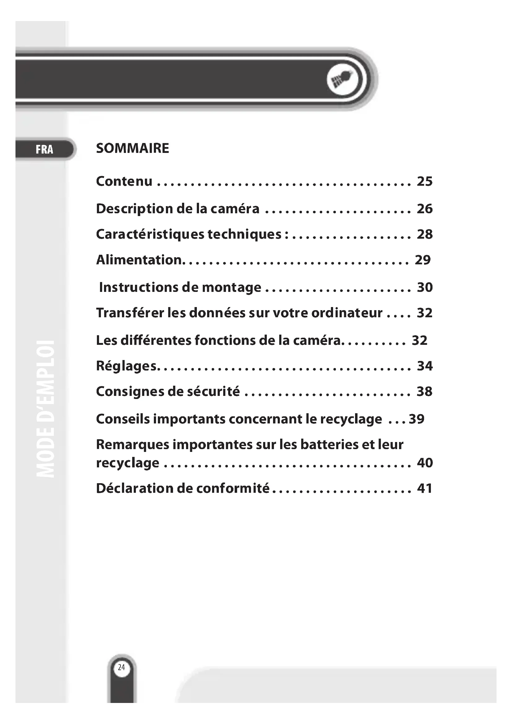 - Verwenden Sie nur den mitgelieferten oder einen passenden gleichwertigen Akku.Contenu . . . . . . . . . . . . . . . . . . . . . . . . . . . . . . . . . . . . . . 25 Description de la caméra . . . . . . . . . . . . . . . . . . . . . . 26 Caractéristiques techniques : . . . . . . . . . . . . . . . . . . 28 Alimentation. . . . . . . . . . . . . . . . . . . . . . . . . . . . . . . . . . 29 Instructions de montage . . . . . . . . . . . . . . . . . . . . . . 30 Transférer les données sur votre ordinateur . . . . 32 Les diérentes fonctions de la caméra. . . . . . . . . . 32 Réglages . . . . . . . . . . . . . . . . . . . . . . . . . . . . . . . . . . . . . . 34 Consignes de sécurité . . . . . . . . . . . . . . . . . . . . . . . . . 38 Conseils importants concernant le recyclage . . . 39 Remarques importantes sur les batteries et leur recyclage . . . . . . . . . . . . . . . . . . . . . . . . . . . . . . . . . . . . . 40 Déclaration de conformité . . . . . . . . . . . . . . . . . . . . . 41 SOMMAIRE FRA