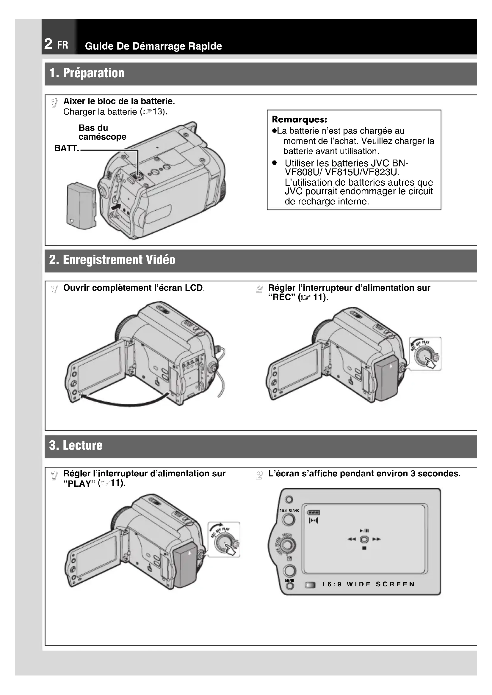 Remarque:● Nous recommandons de nettoyer les têtes vidéo avant chaque utilisation. Si vous n’avez pas utilisé votre caméscope pendant un certain temps, les têtes peuvent être encrassées. Nous recommandons de nettoyer les têtes vidéo périodiquement en utilisant une cassette de nettoyage (optionnelle).Remarque:● Pour lire des images sur un téléviseur connecté (墌 30). GR-D815E_FR.book Page 3 Saturday, March 15, 2008 1:37 PM4 FR MasterPage: Left ● Avant d'enregistrer une vidéo importante, effectuer un enregistrement test.Visualiser l’enregistrement test pour vous assurer que les images et le son ont été enregistrés correctement.● Nous vous recommandons de nettoyer les têtes vidéo avant utilisation.Si votre caméscope est resté inutilisé pendant une période prolongée, il est fort possible que les têtes soient encrassées. Nous vous recommandons donc de nettoyer les têtes régulièrement à l'aide d'une cassette de nettoyage (en option).● Veillez à ranger vos cassettes et votre caméscope dans un endroit approprié.Les têtes vidéo se salissent plus facilement si vous rangez vos cassettes et votre caméscope dans un endroit poussiéreux. Nous vous conseillons de retirer les cassettes du caméscope et de les ranger dans leurs boîtiers. Rangez votre caméscope dans une sacoche. ● Utilisez le mode SP (Standard Play) pour les enregistrements vidéo importants.Le mode LP (Long Play) vous permet d'enregistrer 50% de plus que le mode SP (Standard Play), mais il est possible que des parasites de type mosaïque apparaissent pendant la lecture selon le type de cassette et les conditions d'utilisation.Par conséquent, pour les enregistrements importants, nous vous recommandons d'utiliser le mode SP.● Sécurité et fiabilité.Nous vous recommandons d'utiliser uniquement des batteries et des accessoires JVC avec ce caméscope.● Ce produit inclut des technologies brevetées et autres technologies propriétaires et ne fonctionne qu’avec une batterie intelligente JVC. Utiliser les batteries JVC BN-VF808U/BN-VF815U/BN-VF823U. L'utilisation de batteries génériques non fabriquées par JVC peut endommager le circuit interne de recharge.● Assurez-vous de n'utiliser que des cassettes portant la marque Mini DV .● Notez que ce caméscope n'est pas compatible avec les autres formats vidéo numériques.● Nous vous recommandons d'utiliser des cassettes de la marque JVC.Votre caméscope est compatible avec toutes les marques de cassettes vendues dans le commerce conformes à la norme MiniDV cependant, les cassettes de la marque JVC ont été conçues dans le but d'optimiser les performances de votre appareil.● Nous vous rappelons que ce caméscope est exclusivement destiné à un usage privé. Toute utilisation commerciale sans autorisation préalable est interdite. (Même si vous enregistrez un spectacle, une manifestation ou une représentation pour votre propre plaisir, nous vous recommandons d'obtenir une autorisation préalable).● NE LAISSEZ PAS cet appareil - dans un endroit où la température est supérieure à 50 °C. - dans un endroit où l'humidité est extrêmement faible (inférieure à 35%) ou extrêmement élevée (80%).- à la lumière directe du soleil.- dans un véhicule fermé en été.- à proximité d'une source de chaleur. ● L'écran LCD est fabriqué selon une technologie de haute précision. Des points noirs ou des points lumineux colorés (rouges, verts et bleus) peuvent cependant apparaître et demeurer sur l'écran LCD. Ces points ne sont pas enregistrés sur la cassette. Il ne s'agit pas d'un défaut de l'appareil. (Taux de points efficaces : plus de 99,99%).● Retirez la batterie lorsque vous n'utilisez pas votre caméscope et vérifiez régulièrement s'il fonctionne correctement. Lisez également les “Consignes De Sécurité” pages 36 à 38. Pour Commencer! À Propos Des Batteries DANGER ! Ne démontez pas les batteries et ne les exposez pas à une flamme incandescente ou à une chaleur excessive, car vous pourriez provoquer un incendie ou une explosion. AVERTISSEMENT ! Veillez à ce que la batterie ou les bornes de la batterie n'entrent pas en contact avec des objets métalliques ; ceci pourrait provoquer un court-circuit et entraîner un incendie. Pour désactiver la démonstration, réglez “MODE DEMO” sur “ARRET” (墌 20, 23). GR-D815E_FR.book Page 4 Saturday, March 15, 2008 1:37 PMFR 5 MasterPage: Start_Right FRANCAIS Précautions De Sécurité