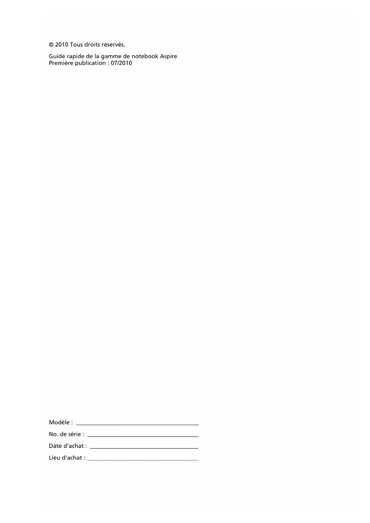4Gamme de notebook Aspire Guide rapideModèle : __________________________________________ No. de série : ______________________________________ Date d’achat : _____________________________________ Lieu d’achat : ______________________________________ © 2010 Tous droits réservés. Guide rapide de la gamme de notebook Aspire Première publication : 07/20103 Pour commencer Nous désirons vous remercier d’avoir fait d’un notebook Acer votre choix pour répondre à vos besoins informatiques mobiles. Vos guides Pour vous aider à utiliser votre notebook Acer, nous avons conçu plusieurs guides : Tout d’abord, le poster de configuration vous aide à configurer votre ordinateur. Le Guide utilisateur générique Aspire contient des informations utiles qui s’appliquent à tous les modèles de la gamme des produits Aspire. Il couvre les sujet de base, telles que l'utilisation du clavier, du son, etc. Il faut comprendre que du fait de sa nature, le Guide utilisateur générique ainsi que le AcerSystem User Guide mentionné ci-dessous fera référence parfois à des fonctions ou des caractéristiques qui ne sont contenues que dans certains modèles de la gamme, mais pas nécessaire dans le modèle que vous avez acheté. Ces cas sont marqués dans le texte avec des mentions telles que « seulement pour certains modèles ». Le Guide rapide présente les fonctionnalités et fonctions de base de votre ordinateur. Pour plus d’information sur l’aide que peut vous apporter pour être plus productif, veuillez vous reporter à AcerSystem User Guide. Ce guide contient des informations détaillées sur des sujets tels que les utilitaires systèmes, la récupération des données, les options d’extension et le dépannage. De plus, il contient des informations de garantie et les réglementations générales et les avis de sécurité pour votre notebook. Il est disponible au format PDF (Portable Document Format) et est préchargé sur votre notebook. Procédez comme suit pour y accéder : 1 Cliquez sur Démarrer > Tous les programmes > AcerSystem. 2 Cliquez sur AcerSystem User Guide. Remarque : L’affichage du fichier nécessite Adobe Reader. Si Adobe Reader n’est pas installé dans votre ordinateur, le clic sur AcerSystem User Guide va exécuter le programme d’installation d’Adobe Reader. Suivez les instructions à l’écran pour terminer l’installation. Pour des instructions sur l’utilisation de Adobe Reader, accédez au menu Aide et Support.4 Français Visite guidée de votre notebook Acer Après avoir configuré votre ordinateur comme illustré dans le poster de configuration, nous allons vous faire explorer votre nouveau notebook Acer. Vue supérieure