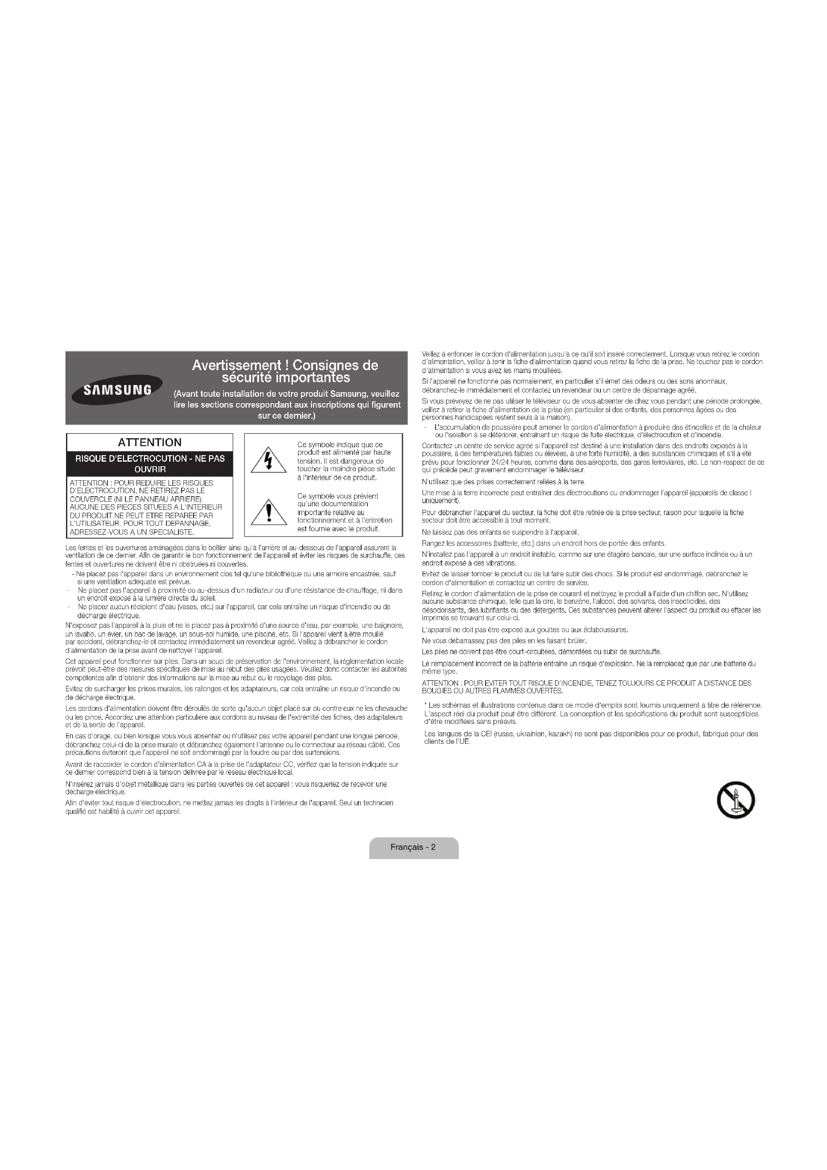 Et voilà! [UD105S9W-ZG]BN68-06528A-03L04.indb 22 2014-08-28 11:28:09Français - 22 Français - 23 Français Spécifications du téléviseur Résolution de l'affichage 5120 x 2160 Courbure de l'écran 4200R Conditions ambiantes Température de fonctionnement Humidité en fonctionnement Température de stockage Humidité sur le lieu de stockage De 10°C à 40°C (De 50°F à 104°F) 10 à 80 %, sans condensation De -20°C à 45°C (De -4°F à 113°F) 5 à 95 %, sans condensation Support pivotant (gauche/droite) 0° Son (sortie) 160W (Caisson de basses (20Wx2), Central-Haut (20Wx2), Central-Bas (20Wx2), Haut-parleur d'aigus (20Wx2)) Nom du modèle UE105S9W Taille de l'écran (diagonale) 105 pouces Dimensions(LxHxP) Corps Avec pied 2452,3 x 1080,2 x 293,0 mm 2491,8 x 1459,9 x 617,6 mm Poids Sans pied Avec pied 90,0 kg 107,0 kg - La conception et les spécifications peuvent être modifiées sans préavis. - Pour plus d'informations sur les caractéristiques d'alimentation et de consommation électrique, reportez-vous à l'étiquette fixée au produit. - La consommation de courant normale est mesurée selon la norme CEI 62087 Ed.2 Mode Veille Pour réduire la consommation électrique, débranchez le cordon d'alimentation lorsque vous n'utilisez pas le téléviseur pendant une période prolongée. [UD105S9W-ZG]BN68-06528A-03L04.indb 23 2014-08-28 11:28:09Français - 24 Licences The terms HDMI and HDMI High-Definition Multimedia Interface, and the HDMI Logo are trademarks or registered trademarks of HDMI Licensing LLC in the United States and other countries. Avertissement relatif aux images fixes Evitez d'afficher à l'écran des images fixes (par ex. fichiers images .jpeg), des éléments d'images fixes (logos de programme de télévision, barres de cotations ou d'infos au bas de l'écran, etc.) ou des images panoramiques ou au format 4:3. L'affichage permanent d'images fixes peut entraîner des phénomènes de brûlure d'écran et altérer la qualité de l'image. Pour atténuer les risques, suivez scrupuleusement les recommandations suivantes: Evitez d'afficher longuement la même chaîne de télévision. Essayez de toujours afficher les images en mode plein écran. Utilisez le menu de format d'image du téléviseur pour obtenir la meilleure configuration. Réduisez la luminosité et le contraste pour éviter l'apparition d'images rémanentes. Utilisez toutes les fonctions conçues pour réduire la rémanence et les brûlures d'écran. Pour en savoir plus, consultez le manuel électronique. Recommandation - UE uniquement Par la présente, SamsungElectronics déclare que ce téléviseur satisfait aux exigences essentielles et aux autres dispositions pertinentes de la directive 1999/5/CE. La déclaration de conformité est accessible à l'adresse http://www.samsung.com/fr, en cliquant sur Assistance, puis en entrant le nom du modèle dans le champ de saisie Obtenir de l'aide pour votre produit. Cet équipement ne doit être utilisé qu'en intérieur. Cet équipement peut fonctionner dans tous les pays de l'UE. Instructions de mise au rebut de ce produit (déchets d'équipements électriques et électroniques) (Applicable dans les pays pratiquant la collecte sélective de déchets) Ce symbole présent sur le produit, ses accessoires ou sa documentation indique que ni le produit, ni ses accessoires électroniques usagés (chargeur, casque audio, câble USB, etc.) ne peuvent être jetés avec les autres déchets ménagers. La mise au rebut incontrôlée des déchets présentant des risques pour l'environnement et la santé publique, veuillez séparer vos produits et accessoires usagés des autres déchets. Vous favoriserez ainsi le recyclage de la matière qui les compose dans le cadre d'un développement durable. Les particuliers sont invités à contacter le magasin leur ayant vendu le produit ou à se renseigner auprès des autorités locales pour connaître les procédures et les points de collecte de ces produits en vue de leur recyclage. Les utilisateurs professionnels doivent contacter leur fournisseur et consulter les conditions générales du contrat d'achat. Ce produit et ses accessoires ne peuvent être jetés avec les autres déchets professionnels et commerciaux. Elimination des piles de ce produit (Applicable dans les pays pratiquant la collecte sélective de déchets) Le symbole présent sur le manuel, l'emballage ou les piles indique que celles-ci ne doivent pas être éliminées en fin de vie avec les autres déchets ménagers. L'indication éventuelle des symboles chimiques Hg, Cd ou Pb signifie que la pile ou l'accumulateur contient des quantités de mercure, de cadmium ou de plomb supérieures aux niveaux de référence stipulés dans la directive 2006/66/CE. Si les piles ne sont pas correctement éliminées, ces substances peuvent porter préjudice à la santé humaine ou à l'environnement. Afin de protéger les ressources naturelles et de favoriser la réutilisation du matériel, veillez à séparer les piles des autres types de déchets et à les recycler via votre système local de collecte gratuite des piles et accumulateurs. [UD105S9W-ZG]BN68-06528A-03L04.indb 24 2014-08-28 11:28:10Français - 24 This page is intentionally left blank. [UD105S9W-ZG]BN68-06528A-03L04.indb 25 2014-08-28 11:28:10Italiano - 2 Italiano - 3 Avvertenza! Istruzioni importanti di sicurezza (Leggere la sezione corrispondente al codice del prodotto Samsung acquistato prima di iniziare l'installazione.) ATTENZIONE