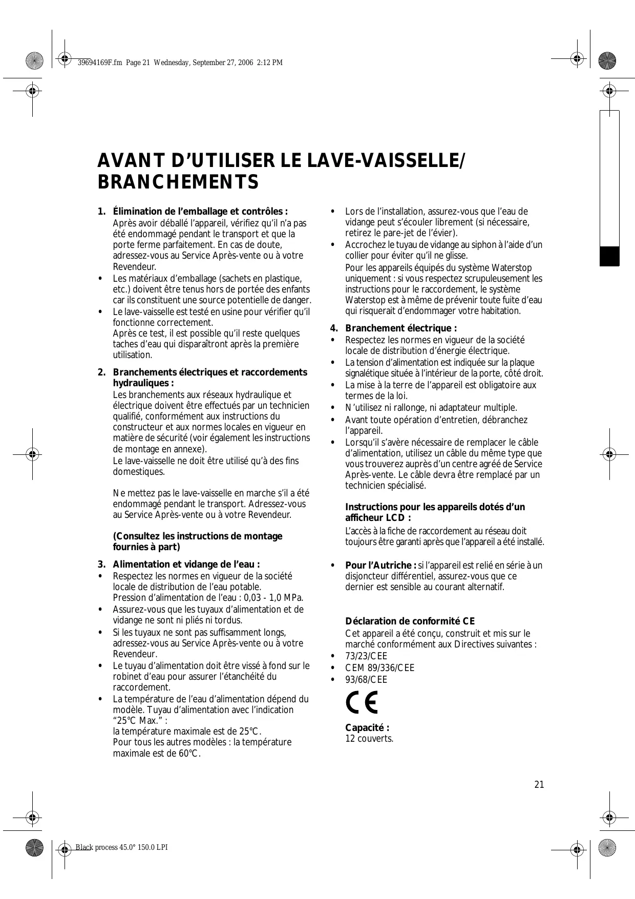 hydrauliques : Les branchements aux réseaux hydraulique et électrique doivent être effectués par un technicien qualifié, conformément aux instructions du constructeur et aux normes locales en vigueur en matière de sécurité (voir également les instructions de montage en annexe). Le lave-vaisselle ne doit être utilisé qu’à des fins domestiques. Ne mettez pas le lave-vaisselle en marche s’il a été endommagé pendant le transport. Adressez-vous au Service Après-vente ou à votre Revendeur. (Consultez les instructions de montage fournies à part)