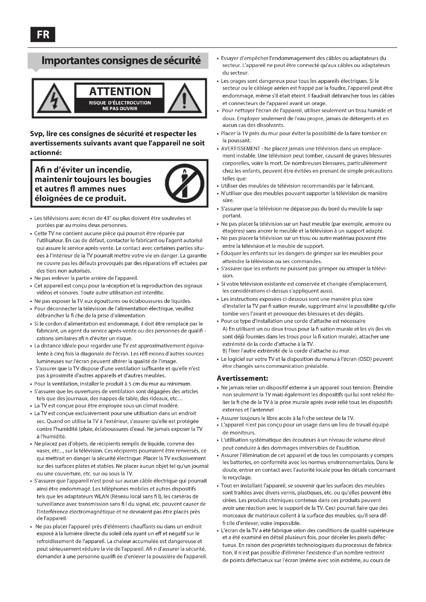 Svp, lire ces consignes de sécurité et respecter les avertissements suivants avant que l'appareil ne soit actionné: A n d’éviter un incendie, maintenir toujours les bougies et autres ammes nues éloignées de ce produit.