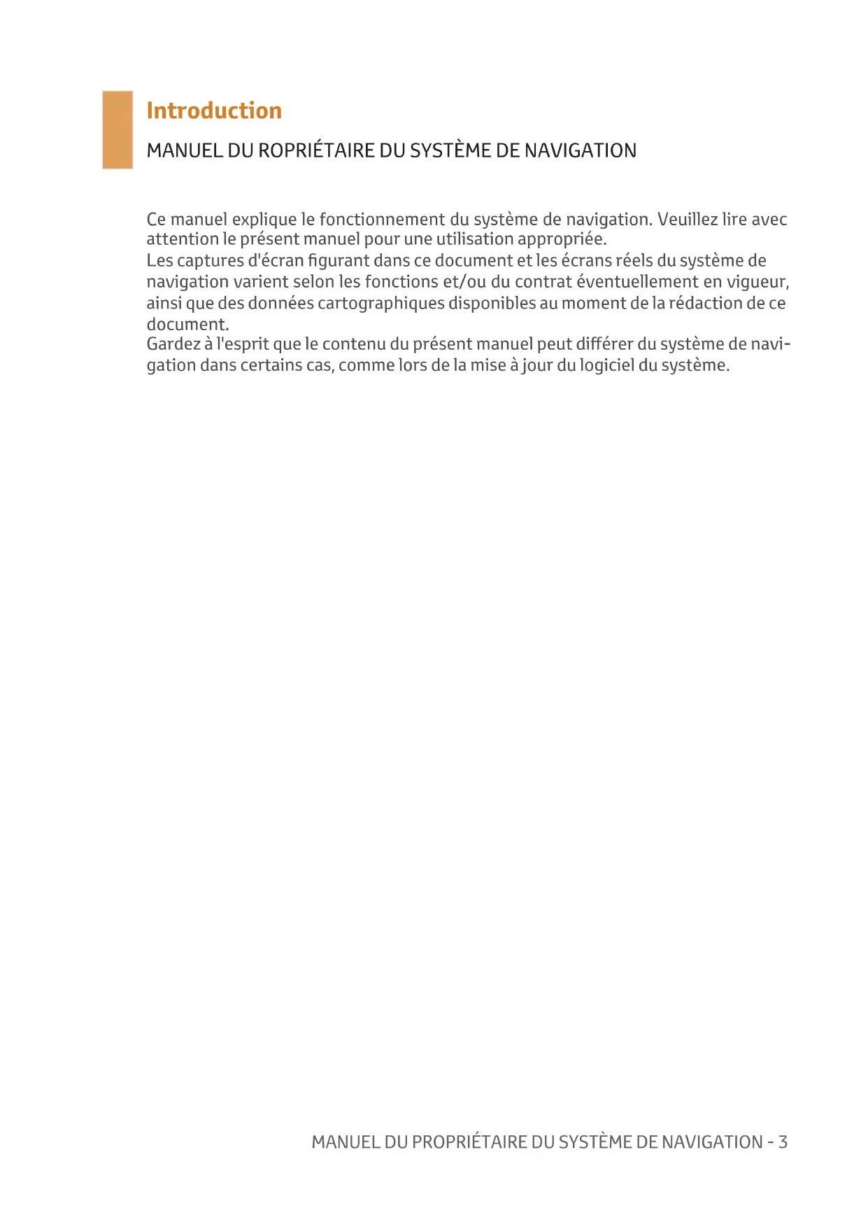 Système de navigation FR_NAVIBOX_OWNERMANUAL_v0.5.indd 1 11/12/14 15:03FR_NAVIBOX_OWNERMANUAL_v0.5.indd 2 11/12/14 15:03MANUEL DU PROPRIÉTAIRE DU SYSTÈME DE NAVIGATION - 3 Introduction MANUEL DU ROPRIÉTAIRE DU SYSTÈME DE NAVIGATION Ce manuel explique le fonctionnement du système de navigation. Veuillez lire avec attention le présent manuel pour une utilisation appropriée. Les captures d'écran gurant dans ce document et les écrans réels du système de navigation varient selon les fonctions et/ou du contrat éventuellement en vigueur, ainsi que des données cartographiques disponibles au moment de la rédaction de ce document. Gardez à l'esprit que le contenu du présent manuel peut diérer du système de navi- gation dans certains cas, comme lors de la mise à jour du logiciel du système. FR_NAVIBOX_OWNERMANUAL_v0.5.indd 3 11/12/14 15:034 - MANUEL DU PROPRIÉTAIRE DU SYSTÈME DE NAVIGATION Instruction de sécurité COMMENT UTILISER CORRECTEMENT LE SYSTÈME DE NAVIGATION Pour utiliser ce système en toute sécu- rité, suivez tous les conseils de sécurité indiqués ci-dessous. Ce système a pour but de vous aider à rejoindre votre des- tination et, s'il est utilisé correctement, vous en ore eectivement la possibi- lité. En tant que conducteur, vous êtes le seul responsable de l'utilisation sans danger de votre véhicule et de la sécuri- té de vos passagers. N'utilisez aucune fonction de ce système si c'est susceptible de vous distraire de votre conduite aux dépens de la sécurité. Vous devez toujours veiller en priorité à conduire votre véhicule en toute sécuri- té. Pendant la conduite, conformez-vous aux réglementations de la circulation. Avant d'utiliser le système, apprenez à vous en servir et à en connaître parfaite- ment le maniement. Lisez l'ensemble du Manuel du propriétaire du système de navigation an d'en comprendre parfai- tement l'utilisation. Ne laissez personne d'autre utiliser le système tant que cette personne n'a pas lu et bien compris les instructions de ce manuel. Pour des raisons de sécurité, certaines fonctions peuvent ne pas être dispo- nibles lors de la conduite. Les touches d'écran non disponibles sont grisées. Pendant que vous conduisez, écoutez les instructions vocales autant que possible et ne jetez un regard furtif à l'écran que lorsque cela ne présente aucun risque. Cependant, ne vous ez pas entièrement au guidage vocal. Ne l'utilisez qu'à titre indicatif. Si le sys- tème n'arrive pas à déterminer correcte- ment la position actuelle du véhicule, il se peut que le guidage vocal soit incor- rect, en retard ou inopérant. Les données du système peuvent se ré- véler parfois incomplètes. Les conditions de circulation, y compris les restrictions de circulation (interdiction de tourner à gauche, routes barrées, etc.) changent fréquemment. Par conséquent, avant de suivre une instruction du système, assu- rez-vous que les instructions peuvent être exécutées en toute sécurité et que vous êtes en accord avec le code de la route. Ce système n'est pas prévu pour vous avertir de la sécurité d'un endroit, de l'état des rues et de la disponibilité des services d'urgence. Si vous n'êtes pas certain de la sécurité d'un endroit, ne vous y engagez pas. Ce système n'est en aucun cas destiné à remplacer le jugement personnel du conducteur. N'utilisez ce système que dans les ré- gions où la loi vous y autorise. PRÉCAUTIONS Soyez très prudent lors de l'utilisation du système de navigation pendant la conduite. Ne pas prêter susamment attention à la route, à la circulation ou aux conditions météorologiques peut engendrer un accident. Pendant la conduite, assurez-vous que vous respectez les règles de circulation et gardez à l'esprit les conditions de circulation. Si un panneau de circulation a été modié sur la route, le guidage d'itinéraire peut fournir des informations erronées telles que le sens d'une rue à sens unique. FR_NAVIBOX_OWNERMANUAL_v0.5.indd 4 11/12/14 15:03MANUEL DU PROPRIÉTAIRE DU SYSTÈME DE NAVIGATION - 5 Avertissements