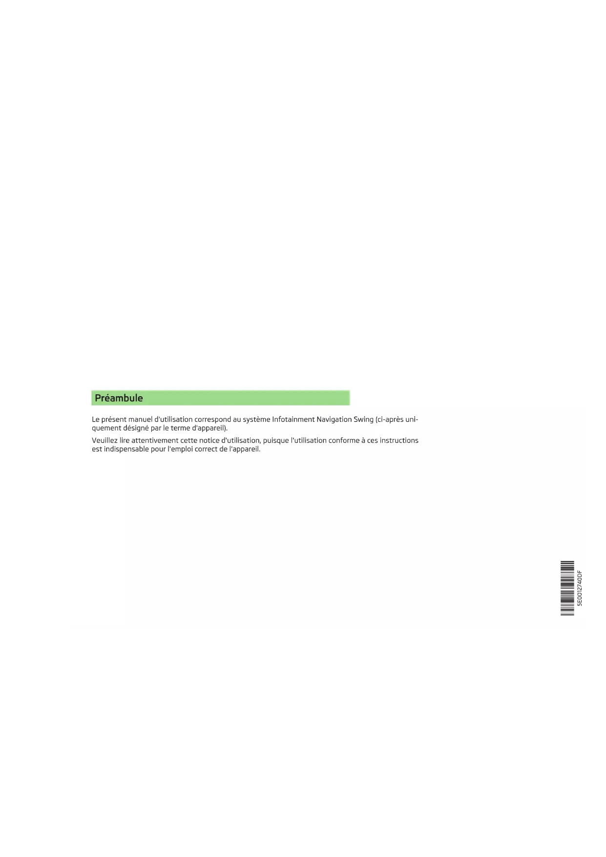 5E0012740DF SIMPLY CLEVER MANUEL D'UTILISATION MANUEL D'UTILISATION Infodivertissement Swing 5E0012740DFPréambule Le présent manuel d'utilisation correspond au système Infotainment Navigation Swing (ci-après uni- quement désigné par le terme d'appareil). Veuillez lire attentivement cette notice d'utilisation, puisque l'utilisation conforme à ces instructions est indispensable pour l'emploi correct de l'appareil.