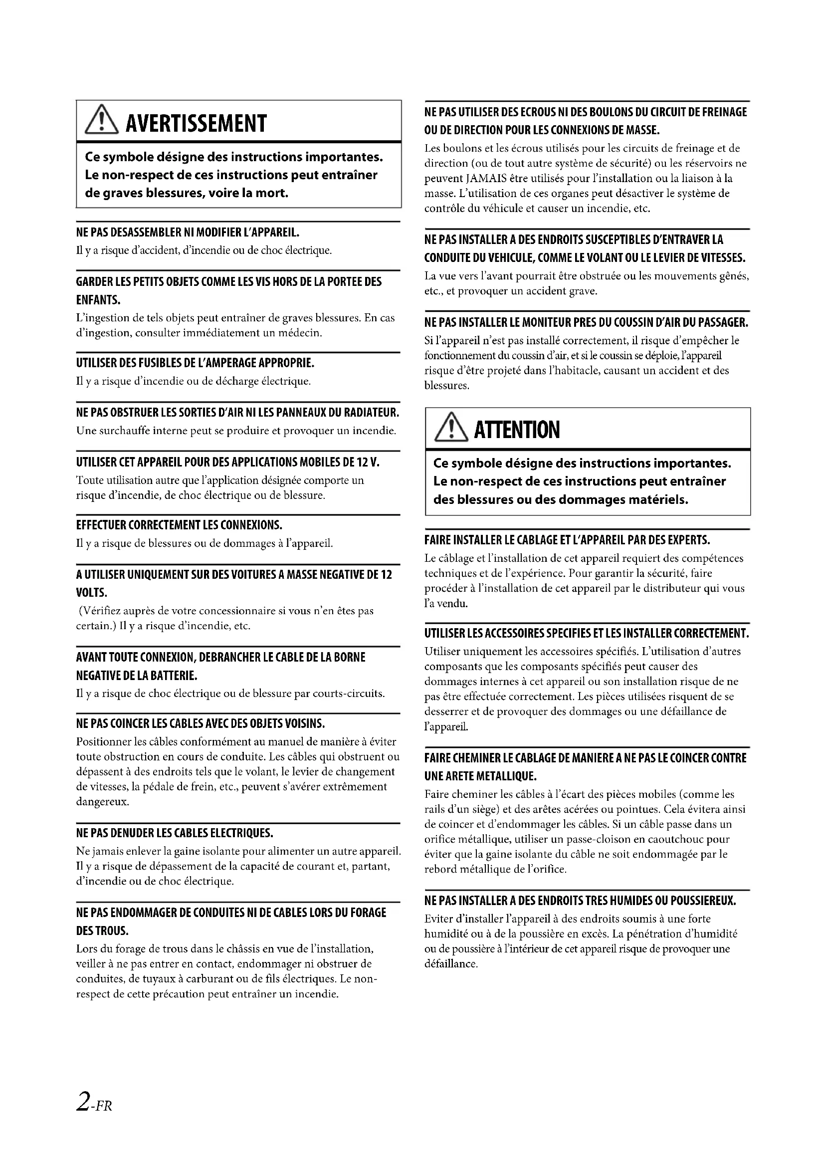 - Exemple de système 03FR00X801D-U.book Page 1 Tuesday, May 19, 2015 1:57 PM2-FR 03FR04X801D-U_FR.fm ALPINE X801D-U/INE-W997D 68-29530Z17-A (FR) NE PAS DESASSEMBLER NI MODIFIER L’APPAREIL. Il y a risque d’accident, d’incendie ou de choc électrique. GARDER LES PETITS OBJETS COMME LES VIS HORS DE LA PORTEE DES ENFANTS. L’ingestion de tels objets peut entraîner de graves blessures. En cas d’ingestion, consulter immédiatement un médecin. UTILISER DES FUSIBLES DE L’AMPERAGE APPROPRIE. Il y a risque d’incendie ou de décharge électrique. NE PAS OBSTRUER LES SORTIES D’AIR NI LES PANNEAUX DU RADIATEUR. Une surchauffe interne peut se produire et provoquer un incendie. UTILISER CET APPAREIL POUR DES APPLICATIONS MOBILES DE 12 V. Toute utilisation autre que l’application désignée comporte un risque d’incendie, de choc électrique ou de blessure. EFFECTUER CORRECTEMENT LES CONNEXIONS. Il y a risque de blessures ou de dommages à l’appareil. A UTILISER UNIQUEMENT SUR DES VOITURES A MASSE NEGATIVE DE 12 VOLTS. (Vérifiez auprès de votre concessionnaire si vous n’en êtes pas certain.) Il y a risque d’incendie, etc. AVANT TOUTE CONNEXION, DEBRANCHER LE CABLE DE LA BORNE NEGATIVE DE LA BATTERIE. Il y a risque de choc électrique ou de blessure par courts-circuits. NE PAS COINCER LES CABLES AVEC DES OBJETS VOISINS. Positionner les câbles conformément au manuel de manière à éviter toute obstruction en cours de conduite. Les câbles qui obstruent ou dépassent à des endroits tels que le volant, le levier de changement de vitesses, la pédale de frein, etc., peuvent s’avérer extrêmement dangereux. NE PAS DENUDER LES CABLES ELECTRIQUES. Ne jamais enlever la gaine isolante pour alimenter un autre appareil. Il y a risque de dépassement de la capacité de courant et, partant, d’incendie ou de choc électrique. NE PAS ENDOMMAGER DE CONDUITES NI DE CABLES LORS DU FORAGE DES TROUS. Lors du forage de trous dans le châssis en vue de l’installation, veiller à ne pas entrer en contact, endommager ni obstruer de conduites, de tuyaux à carburant ou de fils électriques. Le non- respect de cette précaution peut entraîner un incendie. NE PAS UTILISER DES ECROUS NI DES BOULONS DU CIRCUIT DE FREINAGE OU DE DIRECTION POUR LES CONNEXIONS DE MASSE. Les boulons et les écrous utilisés pour les circuits de freinage et de direction (ou de tout autre système de sécurité) ou les réservoirs ne peuvent JAMAIS être utilisés pour l’installation ou la liaison à la masse. L’utilisation de ces organes peut désactiver le système de contrôle du véhicule et causer un incendie, etc. NE PAS INSTALLER A DES ENDROITS SUSCEPTIBLES D’ENTRAVER LA CONDUITE DU VEHICULE, COMME LE VOLANT OU LE LEVIER DE VITESSES. La vue vers l’avant pourrait être obstruée ou les mouvements gênés, etc., et provoquer un accident grave. NE PAS INSTALLER LE MONITEUR PRES DU COUSSIN D’AIR DU PASSAGER. Si l’appareil n’est pas installé correctement, il risque d’empêcher le fonctionnement du coussin d’air, et si le coussin se déploie, l’appareil risque d’être projeté dans l’habitacle, causant un accident et des blessures. FAIRE INSTALLER LE CABLAGE ET L’APPAREIL PAR DES EXPERTS. Le câblage et l’installation de cet appareil requiert des compétences techniques et de l’expérience. Pour garantir la sécurité, faire procéder à l’installation de cet appareil par le distributeur qui vous l’a vendu. UTILISER LES ACCESSOIRES SPECIFIES ET LES INSTALLER CORRECTEMENT. Utiliser uniquement les accessoires spécifiés. L’utilisation d’autres composants que les composants spécifiés peut causer des dommages internes à cet appareil ou son installation risque de ne pas être effectuée correctement. Les pièces utilisées risquent de se desserrer et de provoquer des dommages ou une défaillance de l’appareil. FAIRE CHEMINER LE CABLAGE DE MANIERE A NE PAS LE COINCER CONTRE UNE ARETE METALLIQUE. Faire cheminer les câbles à l’écart des pièces mobiles (comme les rails d’un siège) et des arêtes acérées ou pointues. Cela évitera ainsi de coincer et d’endommager les câbles. Si un câble passe dans un orifice métallique, utiliser un passe-cloison en caoutchouc pour éviter que la gaine isolante du câble ne soit endommagée par le rebord métallique de l’orifice. NE PAS INSTALLER A DES ENDROITS TRES HUMIDES OU POUSSIEREUX. Eviter d’installer l’appareil à des endroits soumis à une forte humidité ou à de la poussière en excès. La pénétration d’humidité ou de poussière à l’intérieur de cet appareil risque de provoquer une défaillance. AVERTISSEMENT Ce symbole désigne des instructions importantes. Le non-respect de ces instructions peut entraîner de graves blessures, voire la mort. ATTENTION Ce symbole désigne des instructions importantes. Le non-respect de ces instructions peut entraîner des blessures ou des dommages matériels. 03FR00X801D-U.book Page 2 Tuesday, May 19, 2015 1:57 PM3-FR 03FR04X801D-U_FR.fm ALPINE X801D-U/INE-W997D 68-29530Z17-A (FR) p. 9