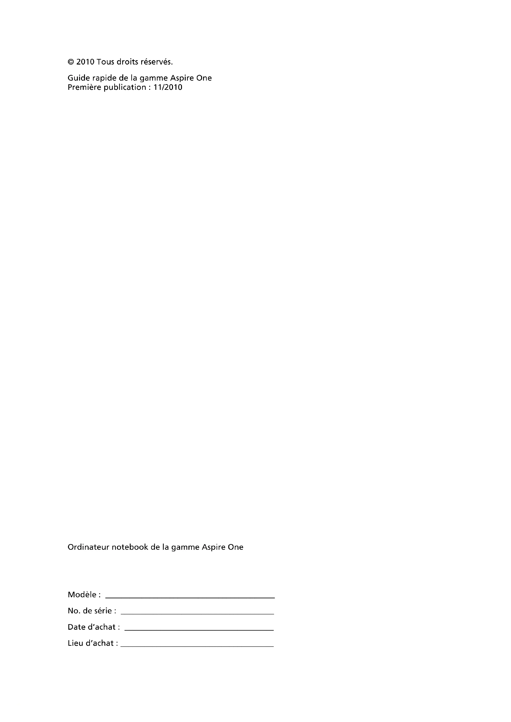 6Gamme Aspire One Guide rapideModèle : __________________________________________ No. de série : ______________________________________ Date d’achat : _____________________________________ Lieu d’achat : ______________________________________ © 2010 Tous droits réservés. Guide rapide de la gamme Aspire One Première publication : 11/2010 Ordinateur notebook de la gamme Aspire One3 Pour commencer Nous désirons vous remercier d’avoir fait d’un notebook Acer votre choix pour répondre à vos besoins informatiques mobiles. Vos guides Pour vous aider à utiliser votre notebook Acer, nous avons conçu plusieurs guides : Tout d’abord, le poster Pour partir du bon pied... vous aide à configurer votre ordinateur. Le Guide utilisateur générique de la gamme Aspire One contient des informations utiles qui s’appliquent à tous les modèles de la gamme des produits Aspire One. Il couvre les sujet de base, telles que l'utilisation du clavier, du son, etc. Il faut comprendre que du fait de sa nature, le Guide utilisateur générique ainsi que le AcerSystem User Guide mentionné ci-dessous fera référence parfois à des fonctions ou des caractéristiques qui ne sont contenues que dans certains modèles de la gamme, mais pas nécessaire dans le modèle que vous avez acheté. Ces cas sont marqués dans le texte avec des mentions telles que « seulement pour certains modèles ». Le Guide rapide présente les fonctionnalités et fonctions de base de votre ordinateur. Pour plus d’information sur l’aide que peut vous apporter pour être plus productif, veuillez vous reporter à AcerSystem User Guide. Ce guide contient des informations détaillées sur des sujets tels que les utilitaires systèmes, la récupération des données, les options d’extension et le dépannage. De plus, il contient des informations de garantie et les réglementations générales et les avis de sécurité pour votre notebook. Il est disponible au format PDF (Portable Document Format) et est préchargé sur votre notebook. Procédez comme suit pour y accéder : 1 Cliquez sur Démarrer > Tous les programmes > puis AcerSystem. 2 Cliquez sur AcerSystem User Guide. Remarque : L’affichage du fichier nécessite Adobe Reader. Si Adobe Reader n’est pas installé dans votre ordinateur, le clic sur AcerSystem User Guide va exécuter le programme d’installation d’Adobe Reader. Suivez les instructions à l’écran pour terminer l’installation. Pour des instructions sur l’utilisation de Adobe Reader, accédez au menu Aide et Support.4 Français Votre visite guidée du notebook Acer Après avoir configuré votre ordinateur comme illustré dans le poster de configuration, nous allons vous faire explorer votre nouveau notebook Acer. Vue supérieure # Icône Élément Description1 Microphone Microphone interne pour l’enregistrement sonore.
