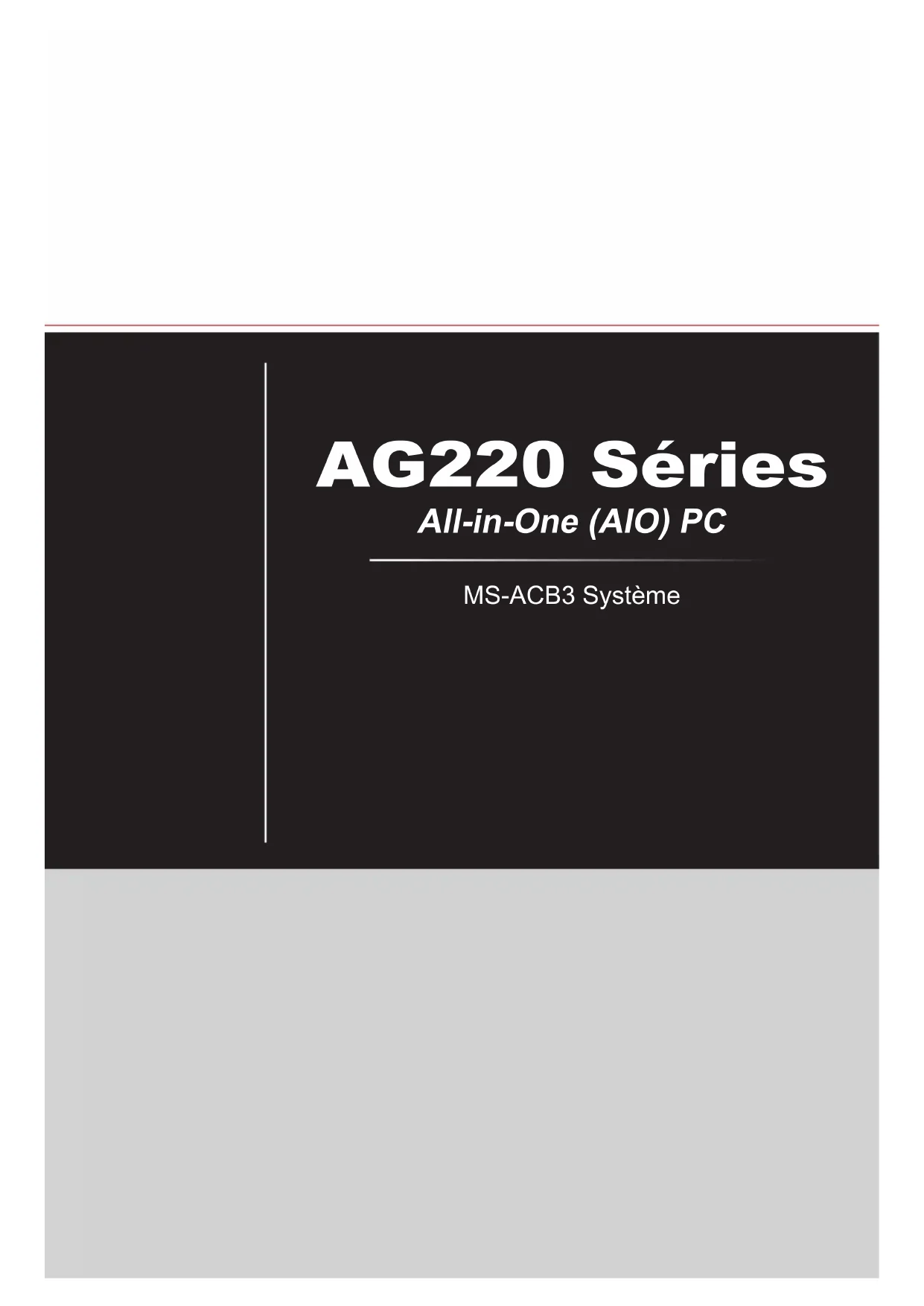 AG220 Séries All-in-One (AIO) PC MS-ACB3 Systèmeii Table des matières Remarque concernant les droits d’auteur iii Marque de commerce iii Révision iii Mise à niveau et garantie iv Achat des éléments remplaçables iv Support technique iv Fonctions du produit écologique iv Politique environnementale v Information des substances chimiques v Information de batterie v Instructions de sécurité vi Conformité CE viii Déclaration FCC-B sur les interférences de radiofréquence viii Déclaration WEEE viii