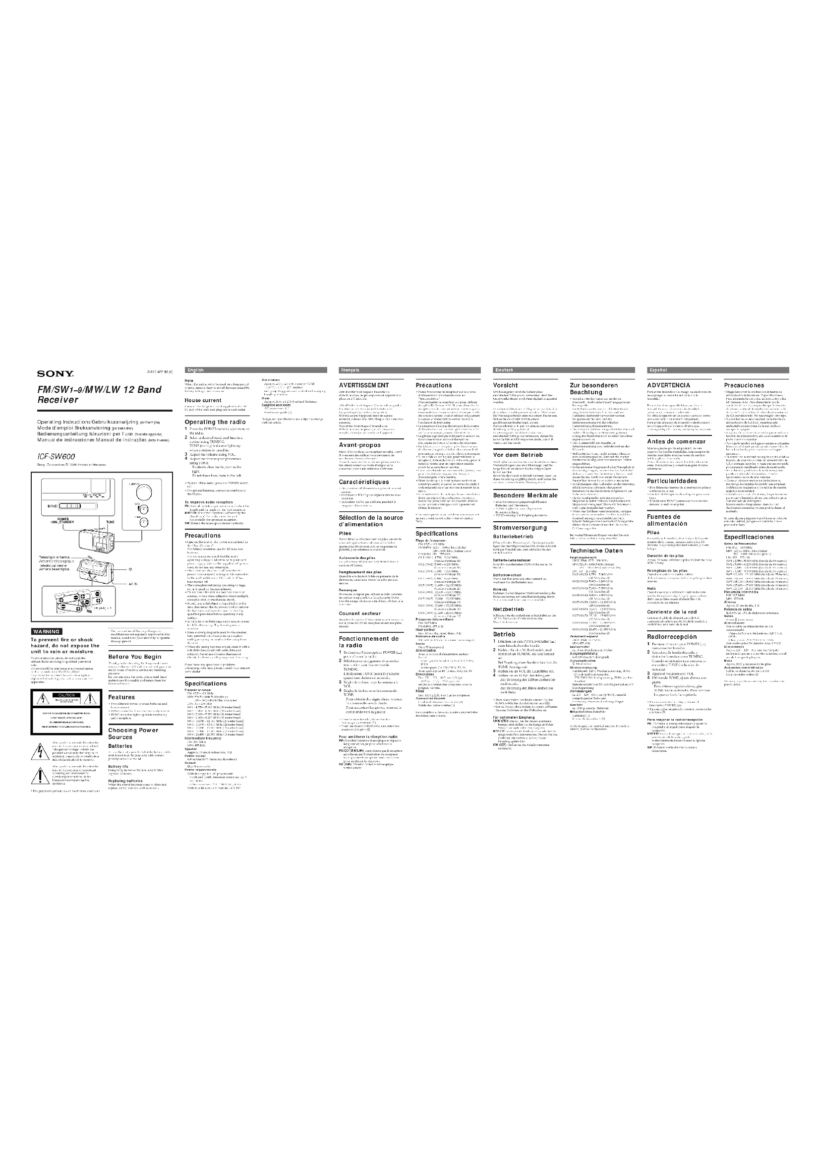 - Haga funcionar la unidad con la fuente dealimentación indicada en “Especificaciones”.Para alimentarla con pilas, utilice cuatro pilasR6 (tamaño AA). Para alimentarla con lacorriente de la red, compruebe que la tensiónde alimentación de la unidad sea idéntica a lade la red local y utilice el cable de alimentaciónde CA suministrado. No use ningún otro tipo.• La unidad no se desconectará de la fuente dealimentación de CA (red) mientras estéenchufada en una toma de la red, inclusoaunque la apague.• La placa de características en la que se indica latensión de alimentación, etc. se encuentra en laparte posterior exterior.• No deje la unidad en lugares cercanos a fuentestérmicas, ni donde pueda quedar sometida a laluz solar directa, polvo excesivo o choquesmecánicos.• Si dentro de la unidad cae algún objeto sólido olíquido, desconecte el cable de alimentación deCA o extraiga las pilas, y haga que sea revisadapor personal cualificado antes de reutilizarla.• En vehículos y edificios, la radiorrecepciónpuede resultar difícil o ruidosa. Pruebeescuchando cerca de una ventana.• Como el altavoz emplea un imán intenso,mantenga las tarjetas de crédito que empleencodificación magnética y los relojes de cuerdaalejados de la unidad.• Cuando se ensucie el exterior, límpielo con unpaño suave humedecido en una solución pococoncentrada de detergente.Nunca emplee limpiadores abrasivos nidisolventes químicos, ya que podría dañar elacabado.Si tiene alguna pregunta o problema en relacióncon esta unidad, póngase en contacto con suproveedor Sony. Especificaciones Gama de frecuencias:FM: 87,5 – 108 MHzMW: 526,5 – 1606,5 kHz (Italia)530 – 1605 kHz (otros países)LW: 153 – 255 kHzSW1 : 4,750 – 5,060 MHz (banda de 60 metros)SW2 : 5,900 – 6,200 MHz (banda de 49 metros)SW3 : 7,100 – 7,350 MHz (banda de 41 metros)SW4 : 9,400 – 9,990 MHz (banda de 31 metros)SW5 : 11,600 – 12,100 MHz (banda de 25 metros)SW6 : 13,570 – 13,870 MHz (banda de 22 metros)SW7 : 15,100 – 15,800 MHz (banda de 19 metros)SW8 : 17,480 – 17,900 MHz (banda de 16 metros)SW9 : 21,450 – 21,850 MHz (banda de 13 metros)Frecuencia intermediaFM: 10,7 MHzMW: 455 kHzAltavozAprox. 10 cm de diá., 8 ΩPotencia de salida430 mW (al 10% de distorsión armónica)SalidaToma @ (minitoma)AlimentaciónCon el cable de alimentación de CAsuministrado:Países de Norte y Sudamérica: 120 V CA,60 HzOtros países: 220–230 V CA, 50 HzCon cuatro pilas R6 (tamaño AA): 6 V CCDimensiones Aprox. 256 × 129 × 60,5 mm (an/al/prf) incluyendo partes y controles salientes, con elasa de transporte plegada Masa Aprox. 1030 g incluyendo las pilasAccesorios suministradosCable de alimentación de CA (1)Guía de ondas cortas (1)Diseño y especificaciones sujetos a cambio sinprevio aviso.Telescopic antennaAntenne télescopiqueTeleskopantenneAntena telescópica English Français AVERTISSEMENT Afin d’éviter tout risque d’incendie oud’électrocution, ne pas exposer cet appareil à lapluie ou à l’humidité.Afin d’éviter tout risque d’électrocution, garderle coffret fermé. Ne confier l’entretien del’appareil qu’à un technicien qualifié.N’installez pas l’appareil dans un espacerestreint, comme une bibliothèque ou un meubleencastré.Pour éviter tout risque d’incendie oud’électrocution, ne posez pas de récipientsremplis d’eau (ex. un vase) sur l’appareil. Avant-propos Merci d’avoir choisi ce récepteur mondial Sony!Il vous sera très utile et vous procurera denombreuses heures d’écoute.Avant la mise en service du récepteur, veuillezlire attentivement ce mode d’emploi et leconserver pour toute référence ultérieure. Caractéristiques
