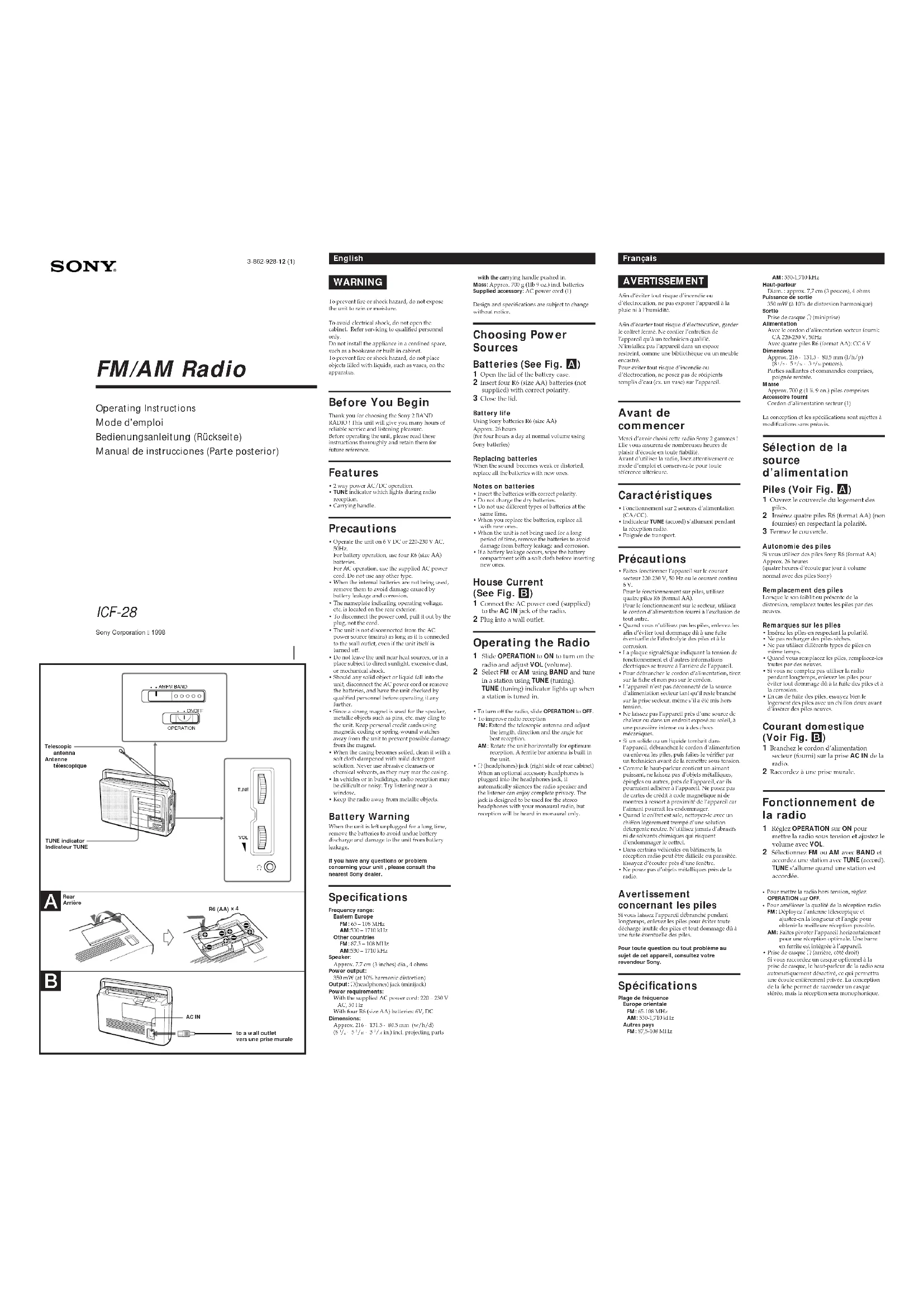 ICF28 - Radio SONY - Notice d'utilisation et mode d'emploi gratuit