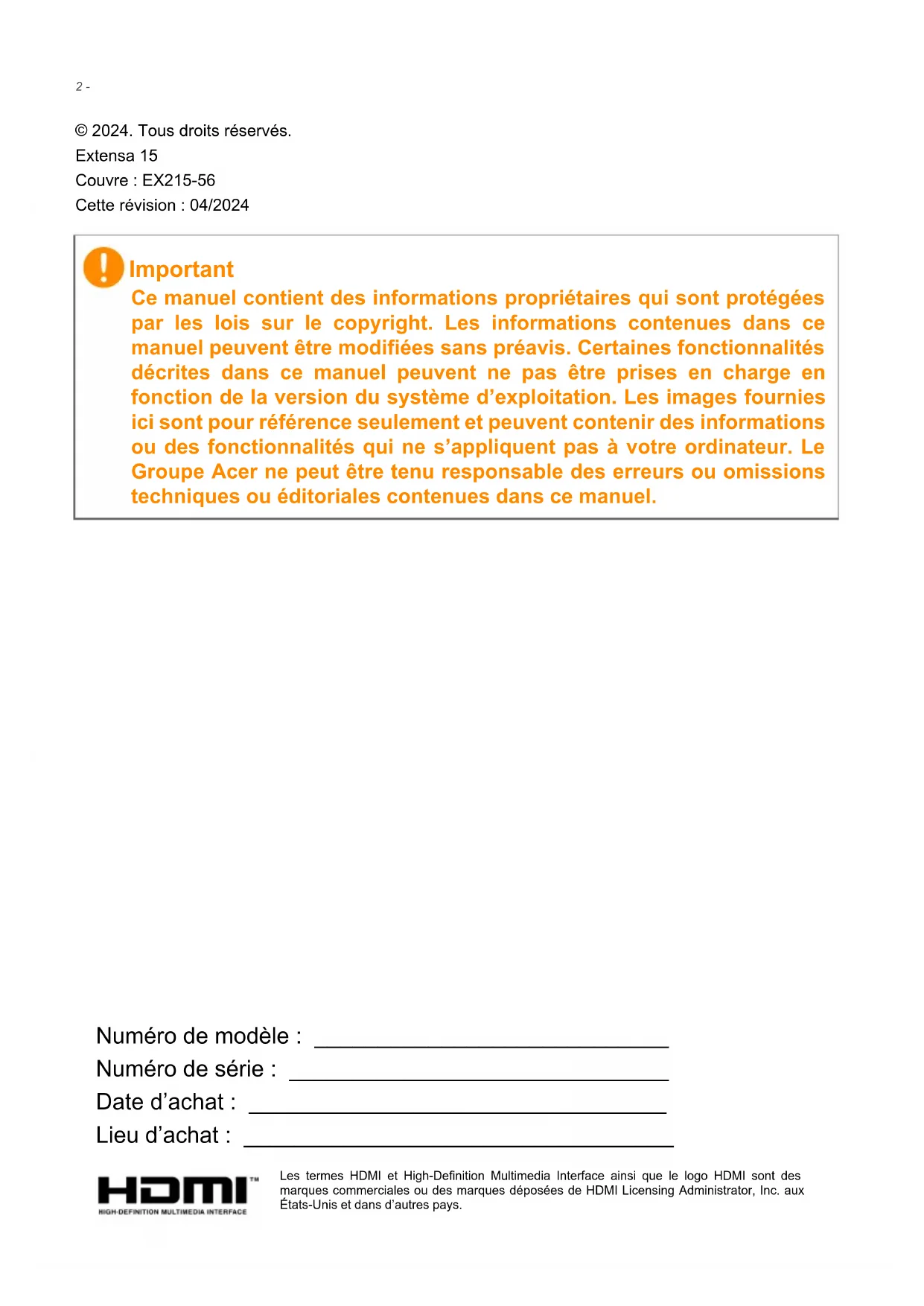 © 2024. Tous droits réservés. Extensa 15 Couvre : EX215-56 Cette révision : 04/2024 Important Ce manuel contient des informations propriétaires qui sont protégées par les lois sur le copyright. Les informations contenues dans ce manuel peuvent être modifiées sans préavis. Certaines fonctionnalités décrites dans ce manuel peuvent ne pas être prises en charge en fonction de la version du système d’exploitation. Les images fournies ici sont pour référence seulement et peuvent contenir des informations ou des fonctionnalités qui ne s’appliquent pas à votre ordinateur. Le Groupe Acer ne peut être tenu responsable des erreurs ou omissions techniques ou éditoriales contenues dans ce manuel. Numéro de modèle : ____________________________ Numéro de série : ______________________________ Date d’achat : _________________________________ Lieu d’achat : __________________________________ Les termes HDMI et High-Definition Multimedia Interface ainsi que le logo HDMI sont des marques commerciales ou des marques déposées de HDMI Licensing Administrator, Inc. aux États-Unis et dans d’autres pays.Table des matières - 3