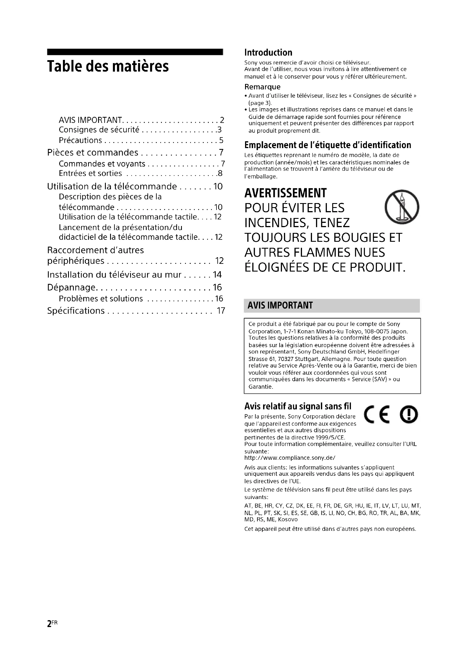ÉLOIGNÉES DE CE PRODUIT. Avis relatif au signal sans fil Par la présente, Sony Corporation déclare que l’appareil est conforme aux exigences essentielles et aux autres dispositions pertinentes de la directive 1999/5/CE.Pour toute information complémentaire, veuillez consulter l’URL suivante:http://www.compliance.sony.de/Avis aux clients: les informations suivantes s’appliquent uniquement aux appareils vendus dans les pays qui appliquent les directives de l’UE.Le système de télévision sans fil peut être utilisé dans les pays suivants:AT, BE, HR, CY, CZ, DK, EE, FI, FR, DE, GR, HU, IE, IT, LV, LT, LU, MT, NL, PL, PT, SK, SI, ES, SE, GB, IS, LI, NO, CH, BG, RO, TR, AL, BA, MK, MD, RS, ME, KosovoCet appareil peut être utilisé dans d’autres pays non européens. AVIS IMPORTANT Ce produit a été fabriqué par ou pour le compte de Sony Corporation, 1-7-1 Konan Minato-ku Tokyo, 108-0075 Japon. Toutes les questions relatives à la conformité des produits basées sur la législation européenne doivent être adressées à son représentant, Sony Deutschland GmbH, Hedelfinger Strasse 61, 70327 Stuttgart, Allemagne. Pour toute question relative au Service Après-Vente ou à la Garantie, merci de bien vouloir vous référer aux coordonnées qui vous sont communiquées dans les documents «Service (SAV)» ou Garantie.3