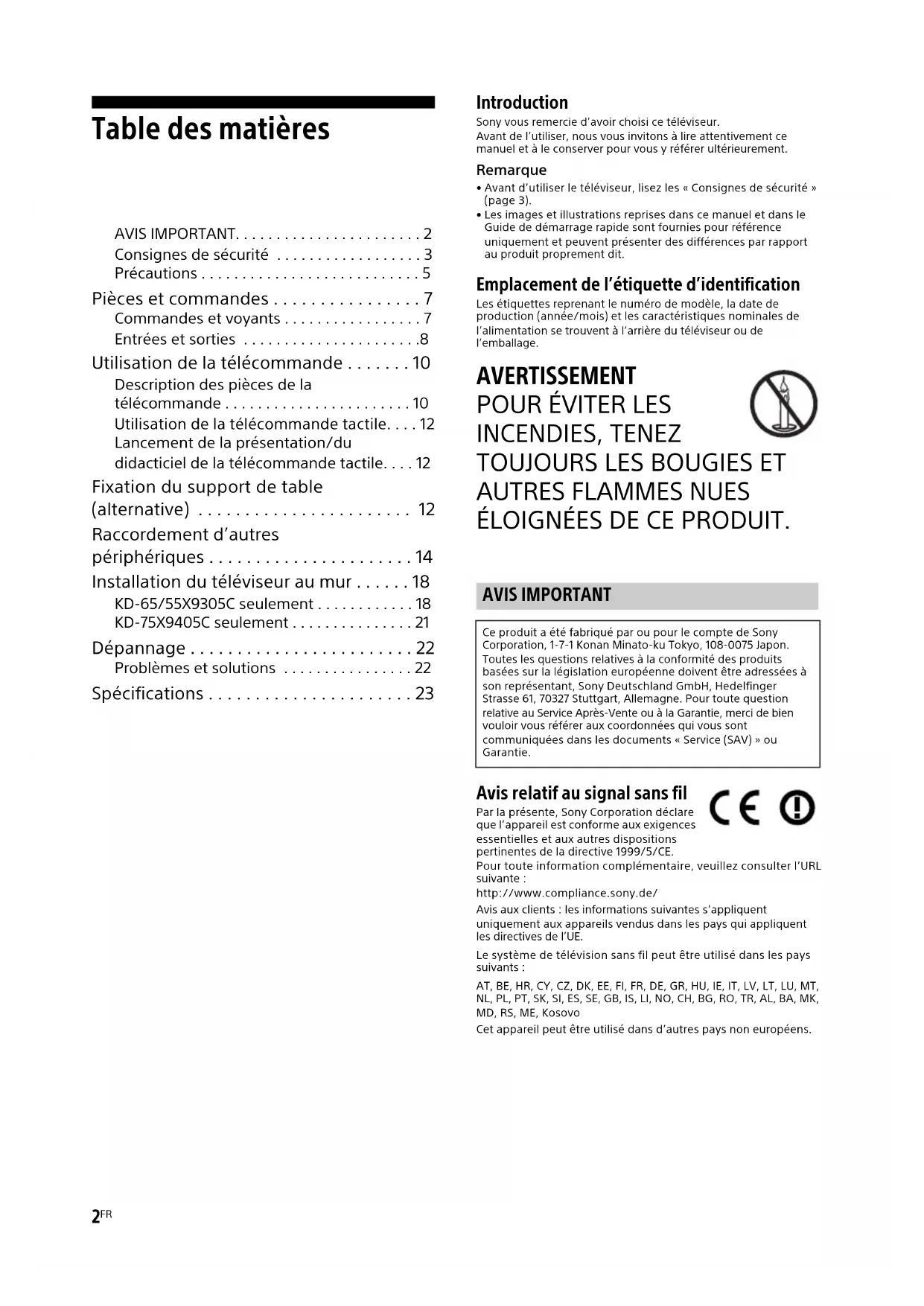 ÉLOIGNÉES DE CE PRODUIT. Avis relatif au signal sans fil Par la présente, Sony Corporation déclare que l’appareil est conforme aux exigences essentielles et aux autres dispositions pertinentes de la directive 1999/5/CE.Pour toute information complémentaire, veuillez consulter l’URL suivante :http://www.compliance.sony.de/Avis aux clients : les informations suivantes s’appliquent uniquement aux appareils vendus dans les pays qui appliquent les directives de l’UE.Le système de télévision sans fil peut être utilisé dans les pays suivants :AT, BE, HR, CY, CZ, DK, EE, FI, FR, DE, GR, HU, IE, IT, LV, LT, LU, MT, NL, PL, PT, SK, SI, ES, SE, GB, IS, LI, NO, CH, BG, RO, TR, AL, BA, MK, MD, RS, ME, KosovoCet appareil peut être utilisé dans d’autres pays non européens. AVIS IMPORTANT Ce produit a été fabriqué par ou pour le compte de Sony Corporation, 1-7-1 Konan Minato-ku Tokyo, 108-0075 Japon. Toutes les questions relatives à la conformité des produits basées sur la législation européenne doivent être adressées à son représentant, Sony Deutschland GmbH, Hedelfinger Strasse 61, 70327 Stuttgart, Allemagne. Pour toute question relative au Service Après-Vente ou à la Garantie, merci de bien vouloir vous référer aux coordonnées qui vous sont communiquées dans les documents «Service (SAV)» ou Garantie.3