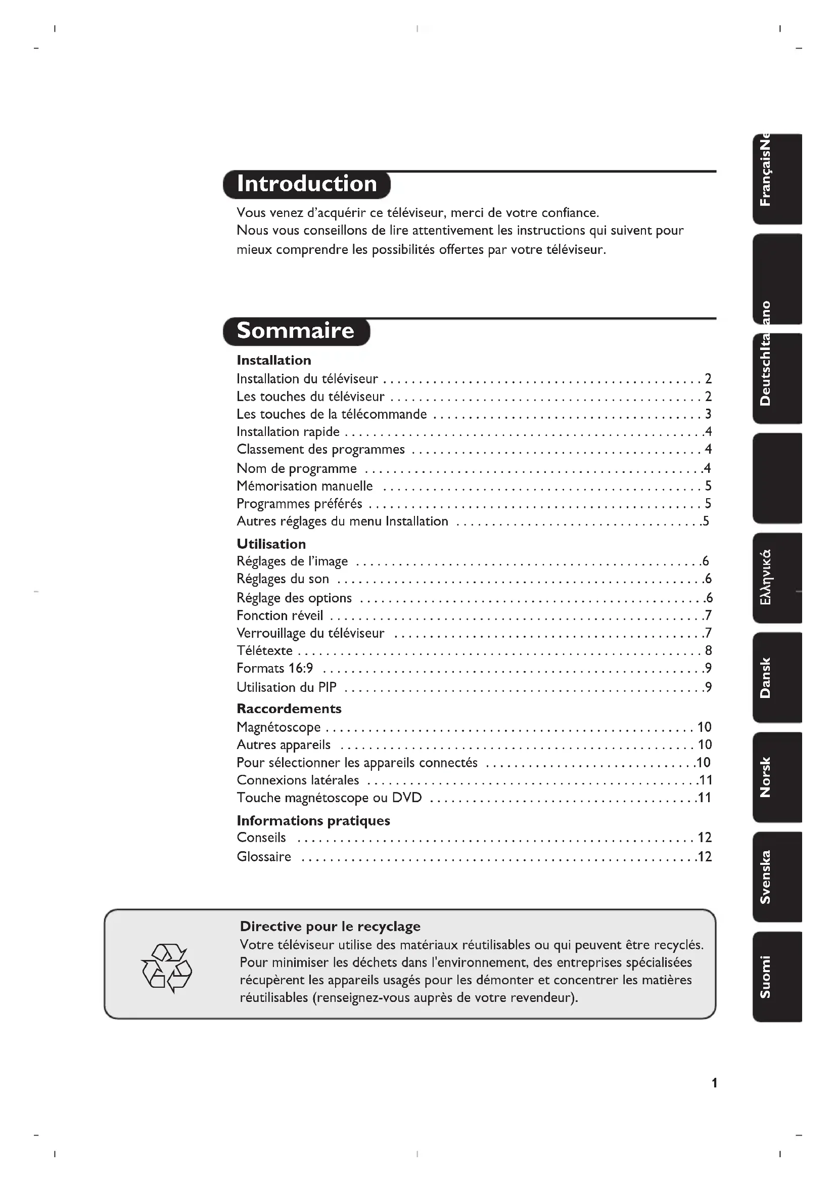 - Poznačte si typové údaje Vášho televízora nachádzajúce sa na obale alebo na zadnej strane prístroja.1 Introduction Sommaire Vous venez d’acquérir ce téléviseur, merci de votre confiance. Nous vous conseillons de lire attentivement les instructions qui suivent pour mieux comprendre les possibilités offertes par votre téléviseur. Installation Installation du téléviseur p. 2