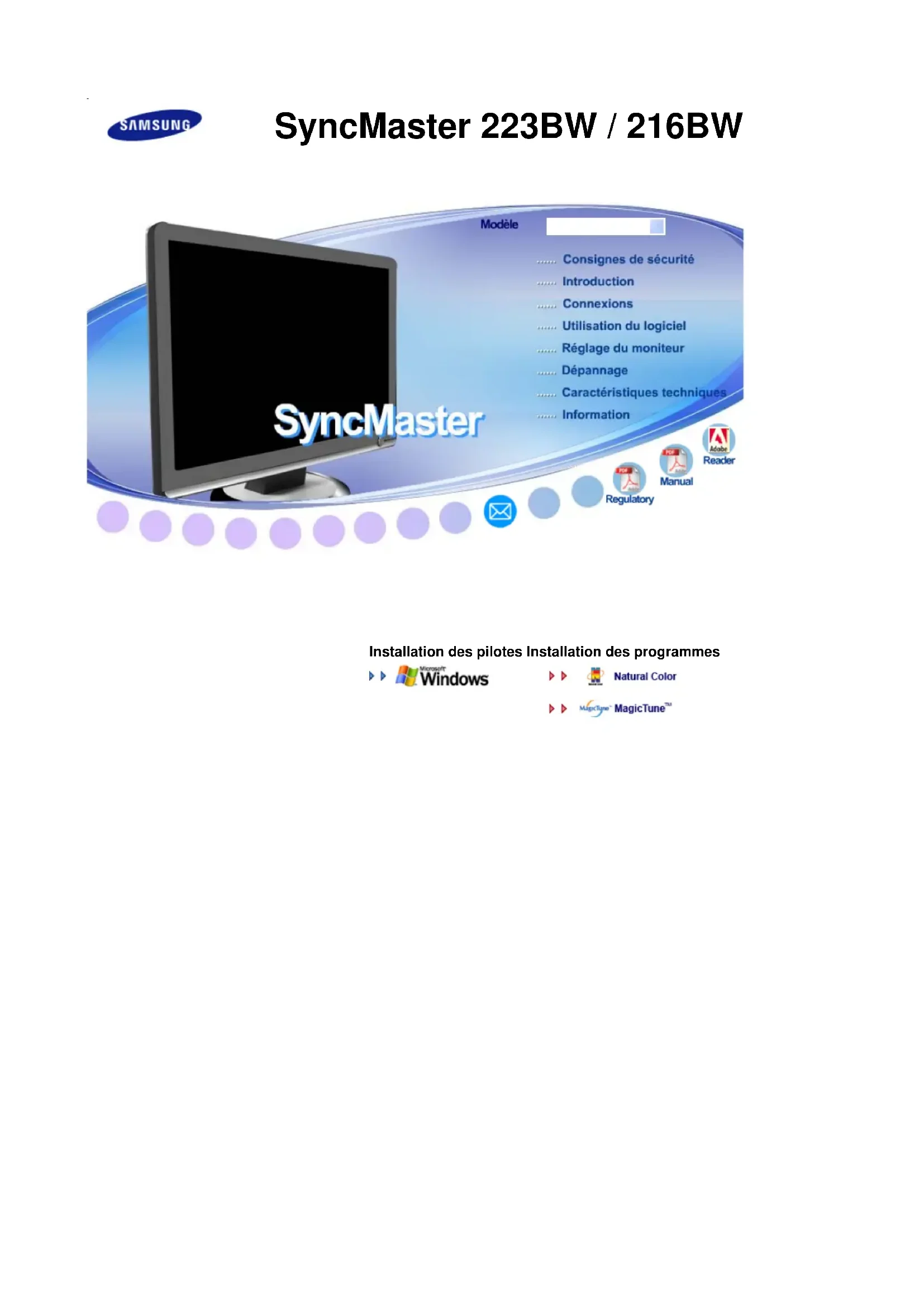 Téléchargez la notice de votre Téléviseur au format PDF gratuitement ! Retrouvez votre notice SyncMaster 223BW - SAMSUNG et reprennez votre appareil électronique en main. Sur cette page sont publiés tous les documents nécessaires à l'utilisation de votre appareil SyncMaster 223BW de la marque SAMSUNG.