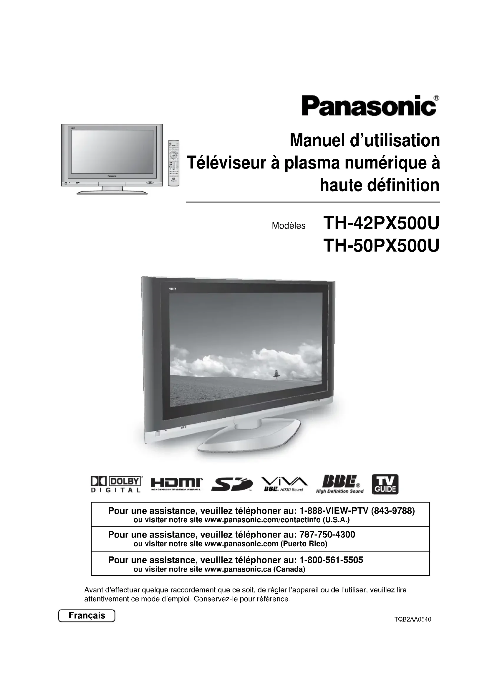 Manuel d’utilisationTéléviseur à plasma numérique àhaute définitionAvant d’effectuer quelque raccordement que ce soit, de régler l’appareil ou de l’utiliser, veuillez lireattentivement ce mode d’emploi. Conservez-le pour référence.FrançaisPour une assistance, veuillez téléphoner au: 1-888-VIEW-PTV (843-9788)ou visiter notre site www.panasonic.com/contactinfo (U.S.A.)Pour une assistance, veuillez téléphoner au: 787-750-4300ou visiter notre site www.panasonic.com (Puerto Rico)Pour une assistance, veuillez téléphoner au: 1-800-561-5505ou visiter notre site www.panasonic.ca (Canada)TH-42PX500UTH-50PX500UModèles