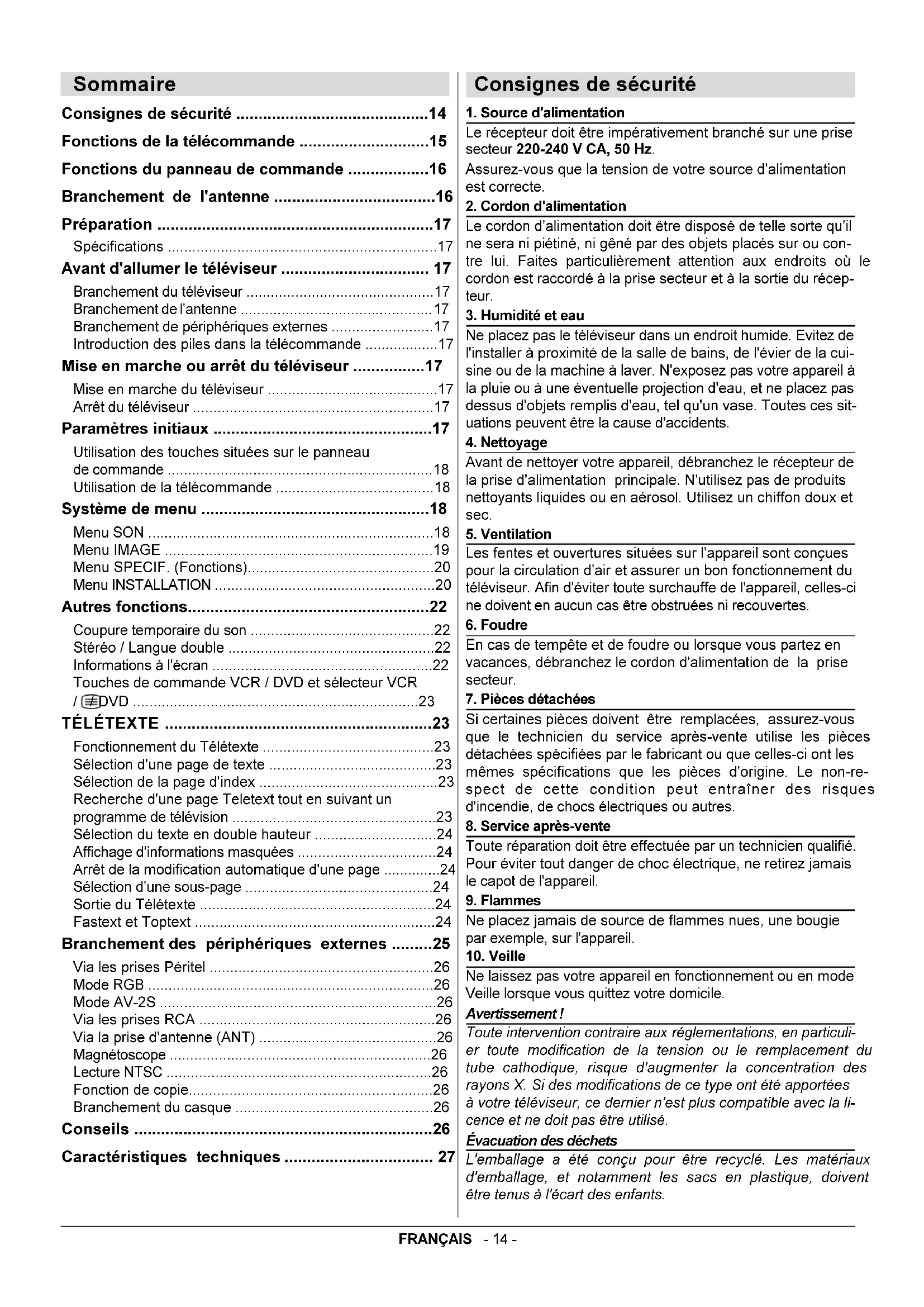 - Ne laissez pas votre appareil en fonctionnement ou en mode Veille lorsque vous quittez votre domicile. Avertissement ! Toute intervention contraire aux réglementations, en particuli- er toute modification de la tension ou le remplacement du tube cathodique, risque d'augmenter la concentration des rayons X. Si des modifications de ce type ont été apportées à votre téléviseur, ce dernier n'est plus compatible avec la li- cence et ne doit pas être utilisé. Évacuation des déchets L'emballage a été conçu pour être recyclé. Les matériaux d'emballage, et notamment les sacs en plastique, doivent être tenus à l'écart des enfants. Sommaire Consignes de sécurité p. 14
