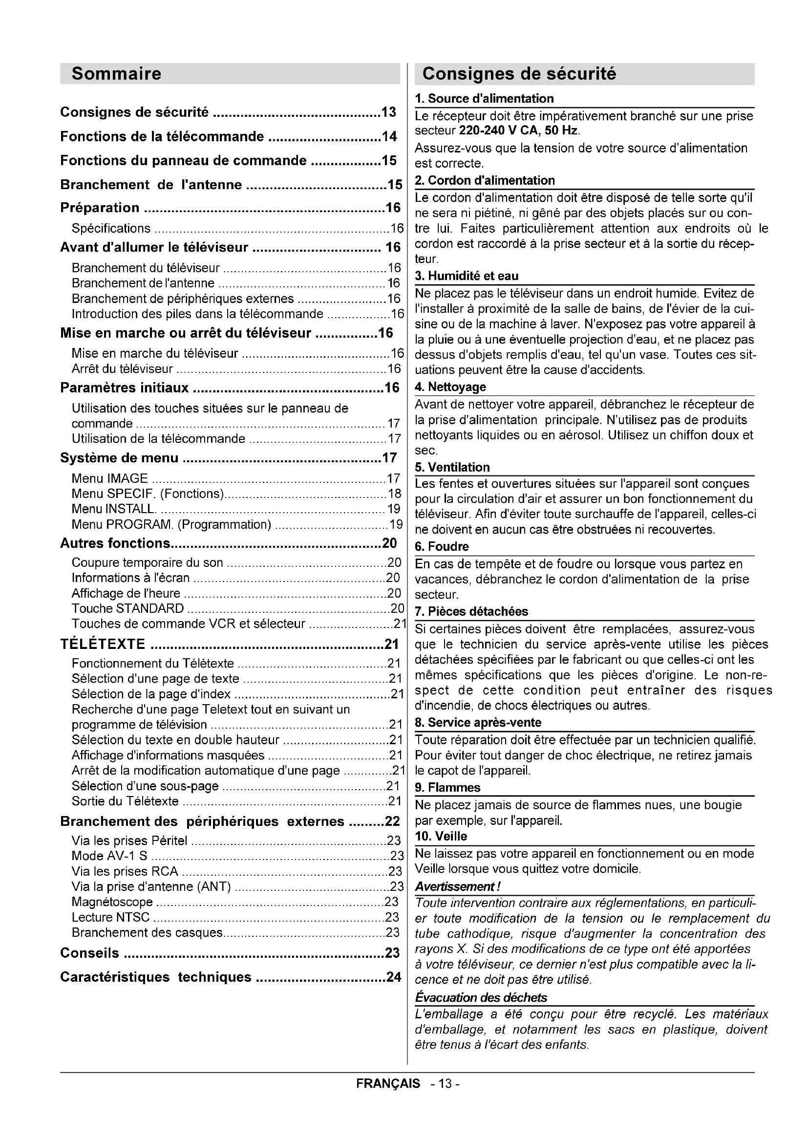 - Ne laissez pas votre appareil en fonctionnement ou en mode Veille lorsque vous quittez votre domicile. Avertissement ! Toute intervention contraire aux réglementations, en particuli- er toute modification de la tension ou le remplacement du tube cathodique, risque d'augmenter la concentration des rayons X. Si des modifications de ce type ont été apportées à votre téléviseur, ce dernier n'est plus compatible avec la li- cence et ne doit pas être utilisé. Évacuation des déchets L'emballage a été conçu pour être recyclé. Les matériaux d'emballage, et notamment les sacs en plastique, doivent être tenus à l'écart des enfants. Sommaire Consignes de sécurité p. 13