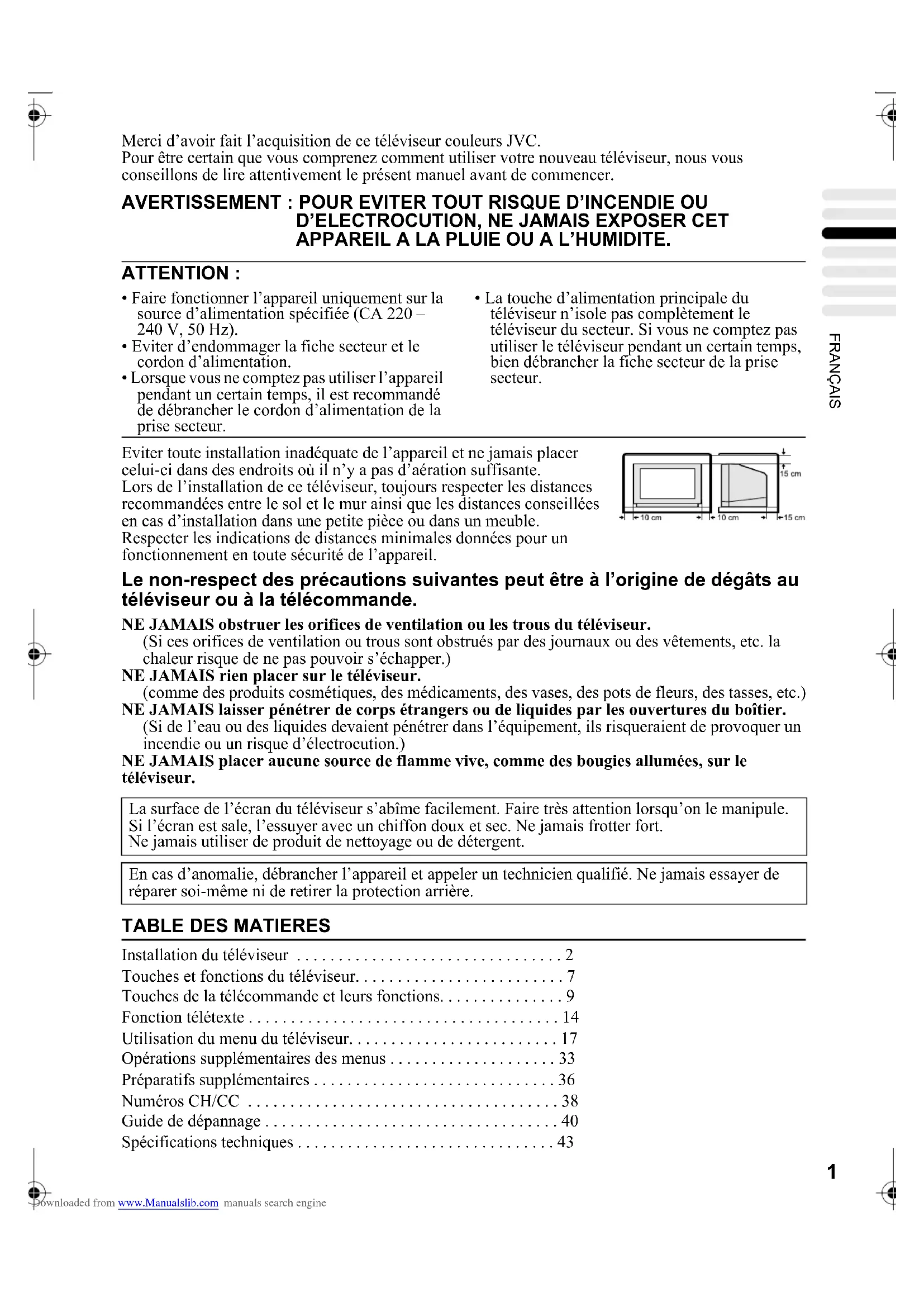 - Video-Eingang, S-VIDEO (Y/C) -Eingang und Audioeingänge V/H sind vorhanden. Kopfhörerbuchse Stereo-Miniklinke (3,5 mm Durchmesser) Abmessungen (B × H × T) 725 mm × 480 mm × 496 mm Gewicht 34,7 kg Zubehör 1 × Fernbedienung (RM-C54 (grau) oder RM-C50 (schwarz) im Lieferumfang.) AAA/R03 Trockenbatterien × 2 AV32&28H20EU_Deu.fm Page 45 Thursday, February 21, 2002 7:40 PM Downloaded from www.Manualslib.com manuals search engine46 AV32/28X25EU / AV32/28H20EU / AV28CH1EU / LCT1142-001A-U / Deutsch AV32&28H20EU_Deu.fm Page 46 Thursday, February 21, 2002 7:40 PM Downloaded from www.Manualslib.com manuals search engine1 FRANÇAIS AV32/28X25EU / AV32/28H20EU / AV28CH1EU / LCT1142-001A-U / Français Merci d’avoir fait l’acquisition de ce téléviseur couleurs JVC. Pour être certain que vous comprenez comment utiliser votre nouveau téléviseur, nous vous conseillons de lire attentivement le présent manuel avant de commencer. Eviter toute installation inadéquate de l’appareil et ne jamais placer celui-ci dans des endroits où il n’y a pas d’aération suffisante. Lors de l’installation de ce téléviseur, toujours respecter les distances recommandées entre le sol et le mur ainsi que les distances conseillées en cas d’installation dans une petite pièce ou dans un meuble. Respecter les indications de distances minimales données pour un fonctionnement en toute sécurité de l’appareil. Le non-respect des précautions suivantes peut être à l’origine de dégâts au téléviseur ou à la télécommande. NE JAMAIS obstruer les orifices de ventilation ou les trous du téléviseur. (Si ces orifices de ventilation ou trous sont obstrués par des journaux ou des vêtements, etc. la chaleur risque de ne pas pouvoir s’échapper.) NE JAMAIS rien placer sur le téléviseur. (comme des produits cosmétiques, des médicaments, des vases, des pots de fleurs, des tasses, etc.) NE JAMAIS laisser pénétrer de corps étrangers ou de liquides par les ouvertures du boîtier. (Si de l’eau ou des liquides devaient pénétrer dans l’équipement, ils risqueraient de provoquer un incendie ou un risque d’électrocution.) NE JAMAIS placer aucune source de flamme vive, comme des bougies allumées, sur le téléviseur.