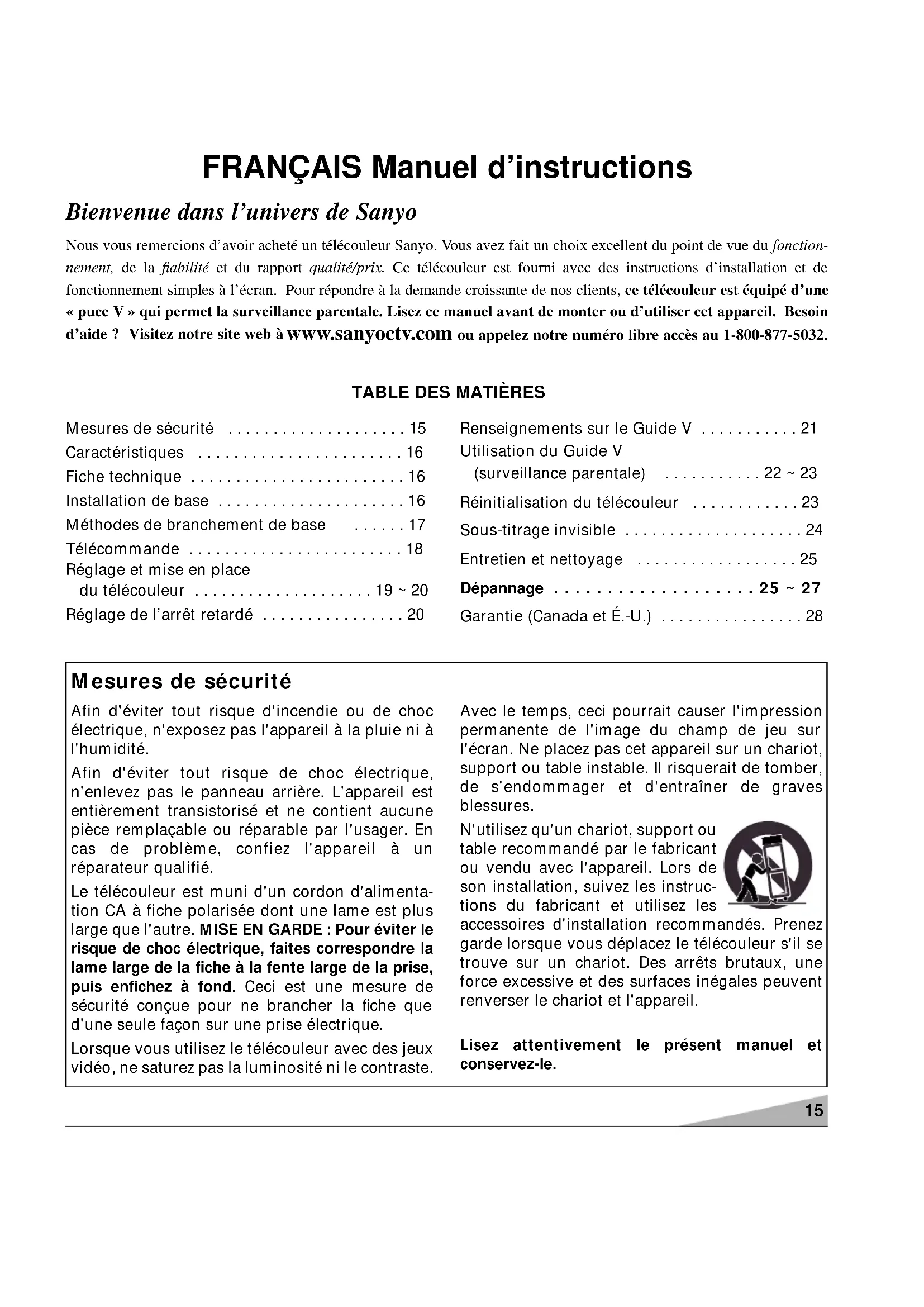 Mesures de sécurité Afin d'éviter tout risque d'incendie ou de choc électrique, n'exposez pas l'appareil à la pluie ni à l'humidité. Afin d'éviter tout risque de choc électrique, n'enlevez pas le panneau arrière. L'appareil est entièrement transistorisé et ne contient aucune pièce remplaçable ou réparable par l'usager. En cas de problème, confiez l'appareil à un réparateur qualifié. Le télécouleur est muni d'un cordon d'alimenta- tion CA à fiche polarisée dont une lame est plus large que l'autre. MISE EN GARDE : Pour éviter le risque de choc électrique, faites correspondre la lame large de la fiche à la fente large de la prise, puis enfichez à fond. Ceci est une mesure de sécurité conçue pour ne brancher la fiche que d'une seule façon sur une prise électrique. Lorsque vous utilisez le télécouleur avec des jeux vidéo, ne saturez pas la luminosité ni le contraste. Avec le temps, ceci pourrait causer l'impression permanente de l'image du champ de jeu sur l'écran. Ne placez pas cet appareil sur un chariot, support ou table instable. Il risquerait de tomber, de s'endommager et d'entraîner de graves blessures. N'utilisez qu'un chariot, support ou table recommandé par le fabricant ou vendu avec l'appareil. Lors de son installation, suivez les instruc- tions du fabricant et utilisez les accessoires d'installation recommandés. Prenez garde lorsque vous déplacez le télécouleur s'il se trouve sur un chariot. Des arrêts brutaux, une force excessive et des surfaces inégales peuvent renverser le chariot et l'appareil. Lisez attentivement le présent manuel et conservez-le. FRANÇAIS Manuel d’instructions Bienvenue dans l’univers de Sanyo Nous vous remercions d’avoir acheté un télécouleur Sanyo. Vous avez fait un choix excellent du point de vue du fonction- nement, de la fiabilité et du rapport qualité/prix. Ce télécouleur est fourni avec des instructions d’installation et de fonctionnement simples à l’écran. Pour répondre à la demande croissante de nos clients, ce télécouleur est équipé d’une « puce V » qui permet la surveillance parentale. Lisez ce manuel avant de monter ou d’utiliser cet appareil. Besoin d’aide ? Visitez notre site web à www.sanyoctv.com ou appelez notre numéro libre accès au 1-800-877-5032.16