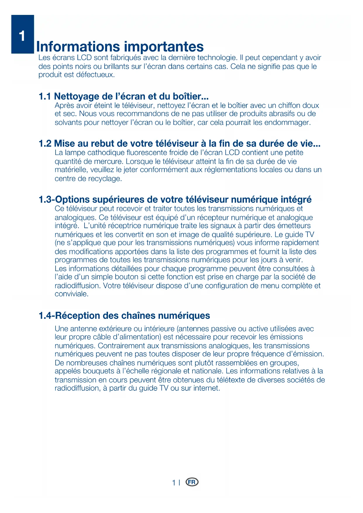 1.2 Mise au rebut de votre téléviseur à la fin de sa durée de vie.... 1