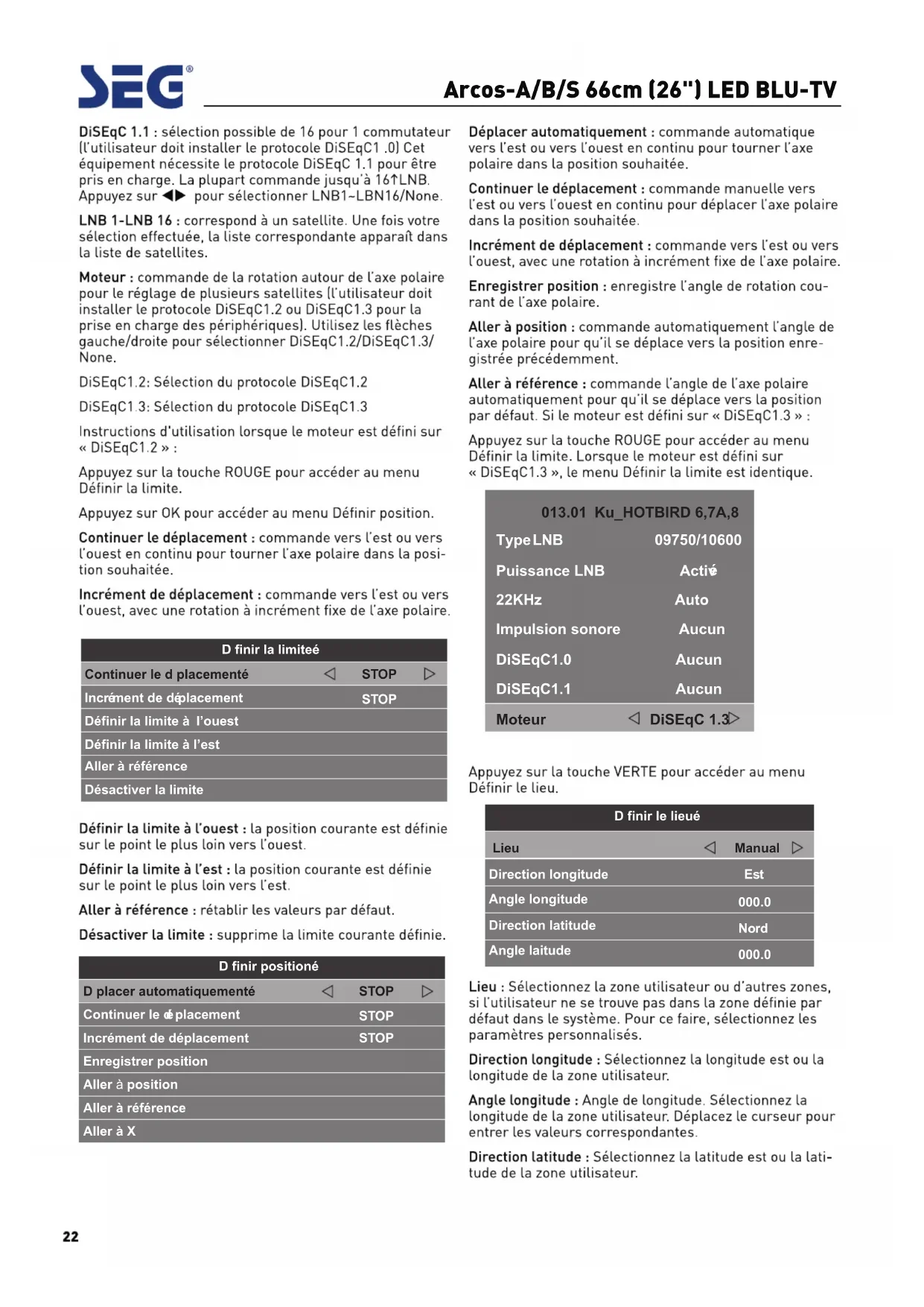 Téléchargez la notice de votre Téléviseur au format PDF gratuitement ! Retrouvez votre notice Arcos - SEG et reprennez votre appareil électronique en main. Sur cette page sont publiés tous les documents nécessaires à l'utilisation de votre appareil Arcos de la marque SEG.