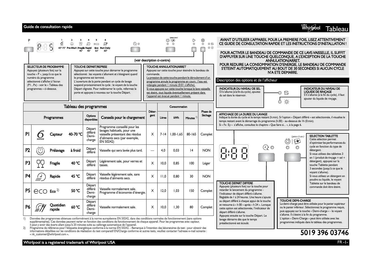 Complet Complet Données des programmes obtenues conformément à la norme européenne EN 50242, dans des conditions normales de fonctionnement (sans options supplémentaires). Ces données peuvent varier en fonction des conditions de fonctionnement de chaque appareil. Pour les programmes avec capteur, il peut y avoir des écarts allant jusqu’à 20 minutes suite au calibrage automatique de l’appareil. Programme de référence pour l’étiquette énergétique conforme à la norme EN 50242. - Remarque à l’intention des laboratoires de test : pour obtenir des informations détaillées sur les conditions de réalisation du test comparatif EN/Charge conforme et autres tests, veuillez contacter l’adresse e-mail suivante : « nk_customer@whirlpool.com ». Whirlpool is a registered trademark of Whirlpool USA Description des options et de l’afficheur