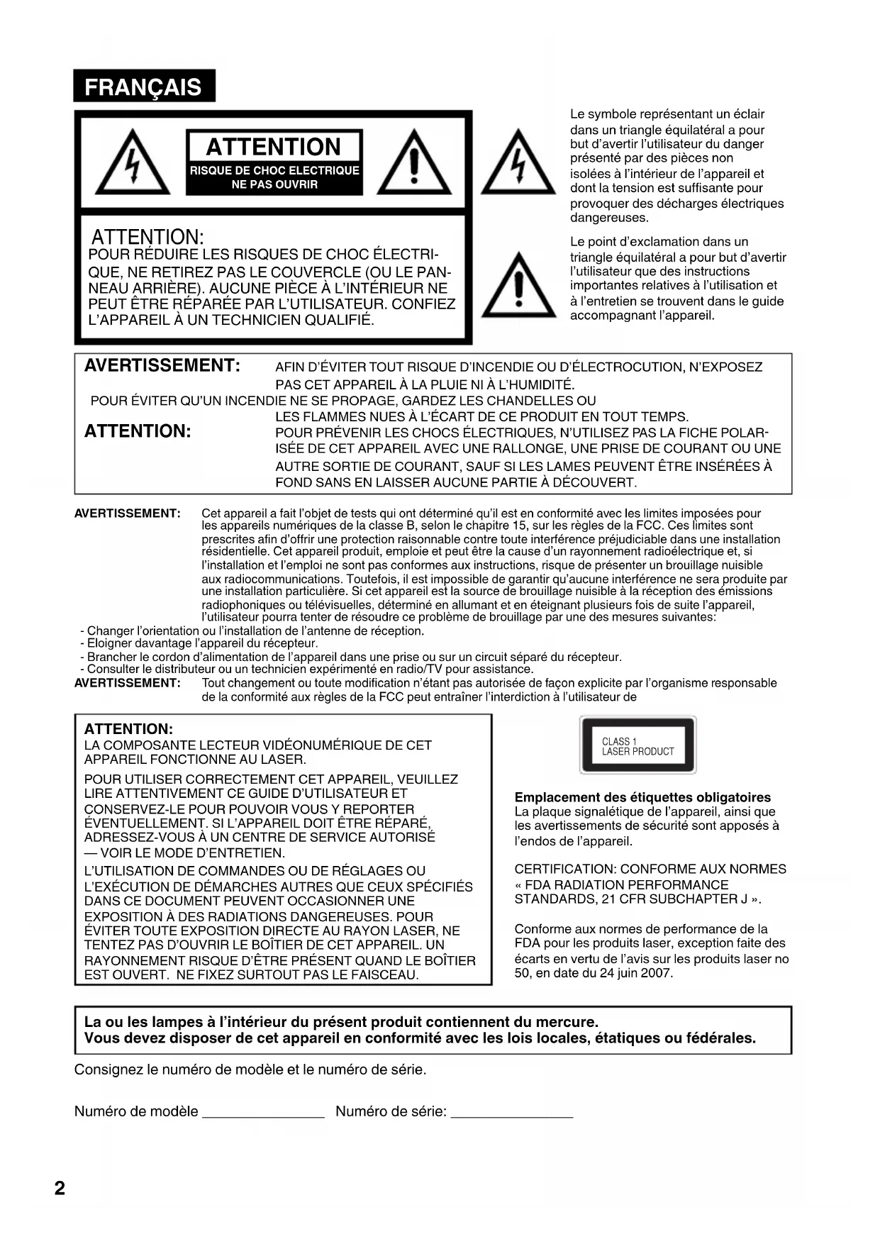 PAS CET APPAREIL À LA PLUIE NI À L’HUMIDITÉ. POUR ÉVITER QU’UN INCENDIE NE SE PROPAGE, GARDEZ LES CHANDELLES OU LES FLAMMES NUES À L’ÉCART DE CE PRODUIT EN TOUT TEMPS. ATTENTION: POUR PRÉVENIR LES CHOCS ÉLECTRIQUES, N’UTILISEZ PAS LA FICHE POLAR- ISÉE DE CET APPAREIL AVEC UNE RALLONGE, UNE PRISE DE COURANT OU UNE AUTRE SORTIE DE COURANT, SAUF SI LES LAMES PEUVENT ÊTRE INSÉRÉES À FOND SANS EN LAISSER AUCUNE PARTIE À DÉCOUVERT.La ou les lampes à l’intérieur du présent produit contiennent du mercure.Vous devez disposer de cet appareil en conformité avec les lois locales, étatiques ou fédérales.RISQUE DE CHOC ELECTRIQUENE PAS OUVRIR ATTENTION FRANÇAIS AVERTISSEMENT: Cet appareil a fait l’objet de tests qui ont déterminé qu’il est en conformité avec les limites imposées pour les appareils numériques de la classe B, selon le chapitre 15, sur les règles de la FCC. Ces limites sont prescrites afin d’offrir une protection raisonnable contre toute interférence préjudiciable dans une installation résidentielle. Cet appareil produit, emploie et peut être la cause d’un rayonnement radioélectrique et, si l’installation et l’emploi ne sont pas conformes aux instructions, risque de présenter un brouillage nuisible aux radiocommunications. Toutefois, il est impossible de garantir qu’aucune interférence ne sera produite par une installation particulière. Si cet appareil est la source de brouillage nuisible à la réception des émissions radiophoniques ou télévisuelles, déterminé en allumant et en éteignant plusieurs fois de suite l’appareil, l’utilisateur pourra tenter de résoudre ce problème de brouillage par une des mesures suivantes: - Changer l’orientation ou l’installation de l’antenne de réception. - Eloigner davantage l’appareil du récepteur. - Brancher le cordon d’alimentation de l’appareil dans une prise ou sur un circuit séparé du récepteur. - Consulter le distributeur ou un technicien expérimenté en radio/TV pour assistance. AVERTISSEMENT: Tout changement ou toute modification n’étant pas autorisée de façon explicite par l’organisme responsable de la conformité aux règles de la FCC peut entraîner l’interdiction à l’utilisateur de Consignez le numéro de modèle et le numéro de série.Numéro de modèle _______________ Numéro de série: _______________CLASS 1LASER PRODUCT 52D0121B.indb 252D0121B.indb 2 5/18/09 5:37:36 PM5/18/09 5:37:36 PM3 FRANÇAIS